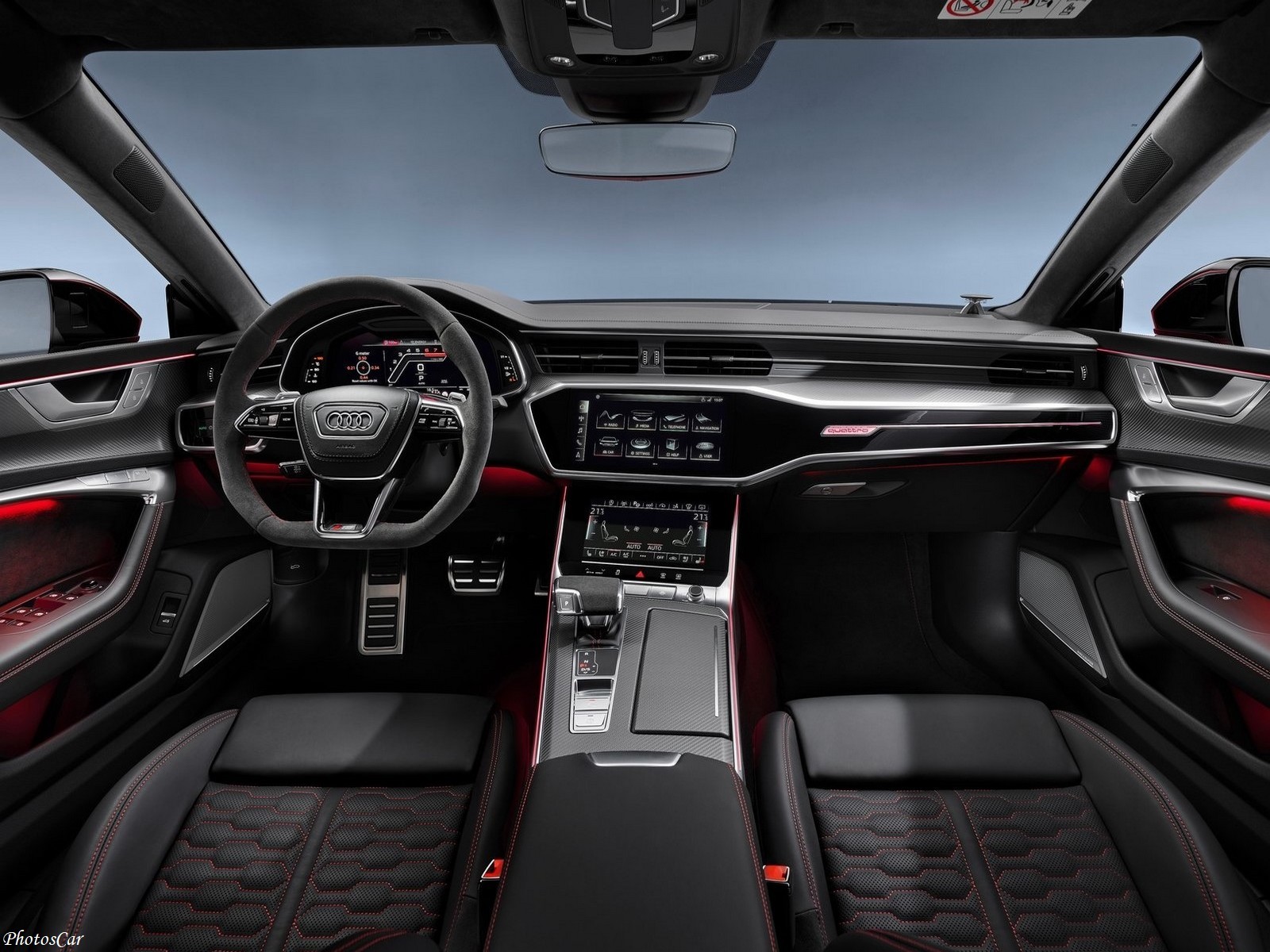 Un volant sport RS en cuir perforé à fond plat se trouve devant le conducteur. Il est équipé de palettes de changement de vitesses en aluminium. Il comprend également des touches pour les nouveaux modes de conduite configurables RS1 et RS2. Il y a également quelques logos RS et RS7 dans la cabine! Cela vous rappelle la voiture que vous avez achetée. L’ emblème Audi Sport est projeté sur le sol lorsque les portières sont ouvertes.