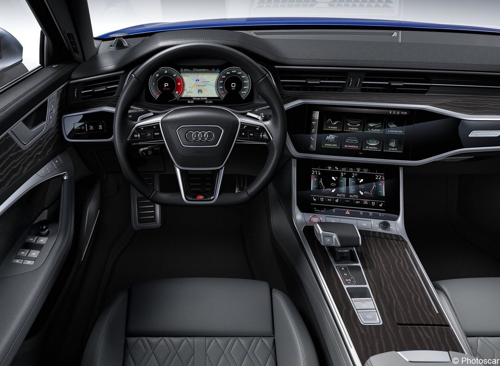 Les sièges Sport faits d’Alcantara et de cuir vous procurent un grand confort d’assise. Ainsi qu’un très bon maintien latéral. En option, les sièges Sport S en cuir Valcona avec renforts latéraux [sont] siglés du logo S6 embossé sur les dossiers. Les détails sportifs se mêlent à une ergonomie parfaite; radio, système d’information, téléphone et navigation sont facilement contrôlables depuis le volant Sport multifonction en cuir. Ce dernier, équipé en plus des palettes de changement de vitesses en aluminium. Cela permet ainsi d’égrener les sept rapports avec une totale maîtrise. Site officiel Audi