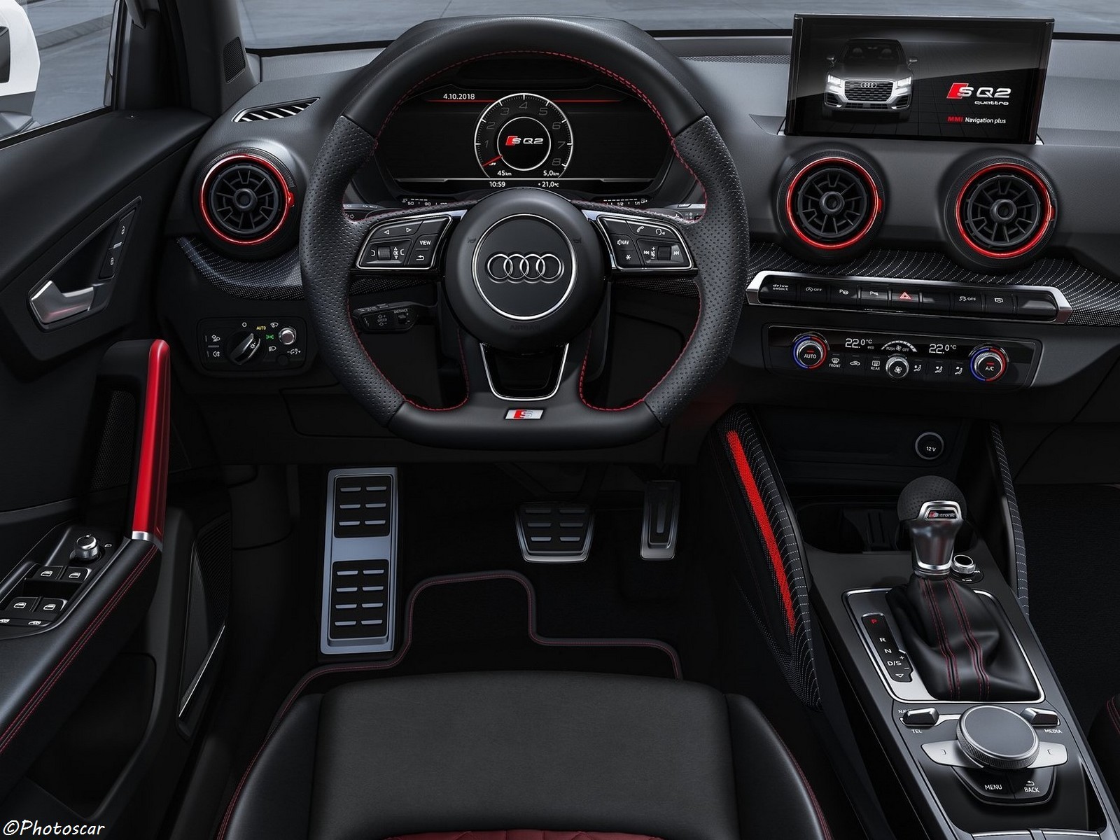 Par rapport à la norme Q3, l’ Audi SQ2 est dotée de prises d’air plus importantes à l’avant pour mieux refroidir le moteur, tandis que les nouvelles roues de 18 ou 19 « sont neuves. Double paire de sorties d’échappement à l’arrière, qui complète le tableau grâce à des appendices aérodynamiques ad hoc et à un profil d’aile garantissant un impact visuel certain. L’ Audi Virtual Cockpit , le système multimédia MMI, les pédales en aluminium, l’affichage tête haute et toute la gamme de services Audi Connect ne manquent pas dans le catalogue .
