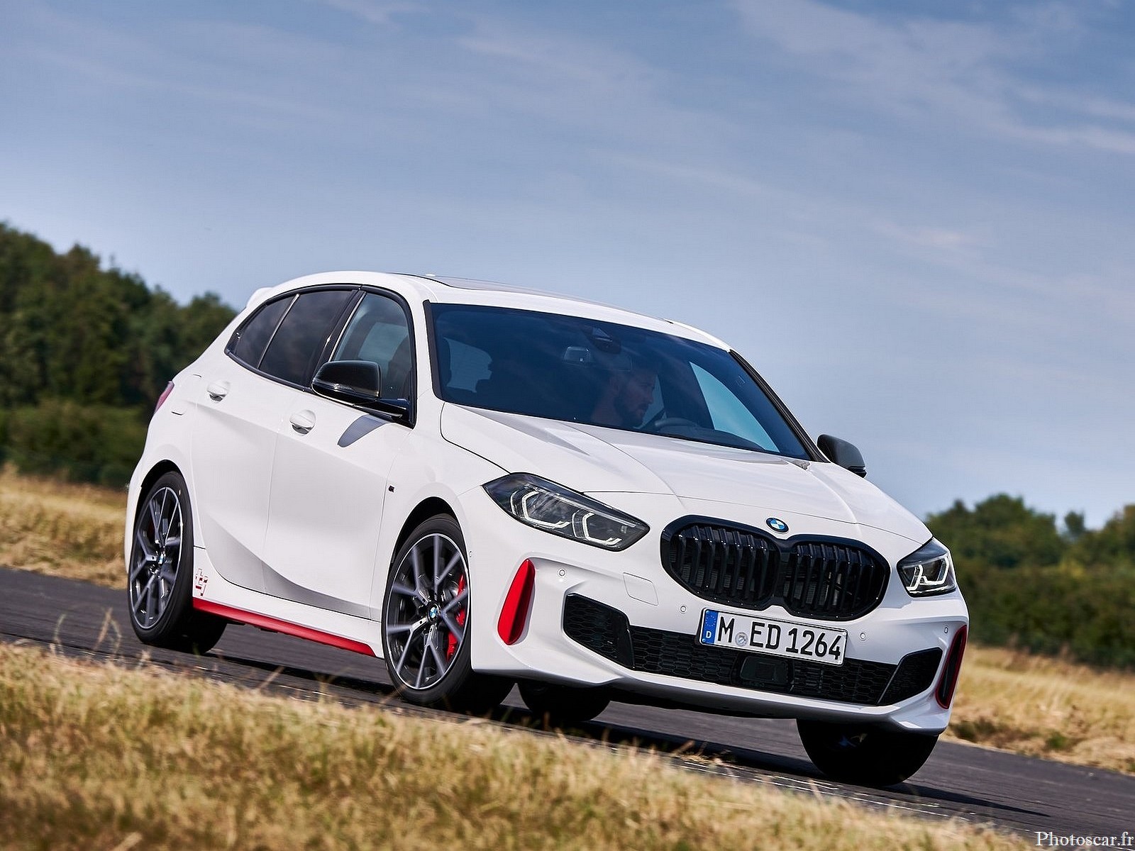 La BMW 128ti 2021 obtient des éclairs de rouge sur la carrosserie d’une voiture blanche.