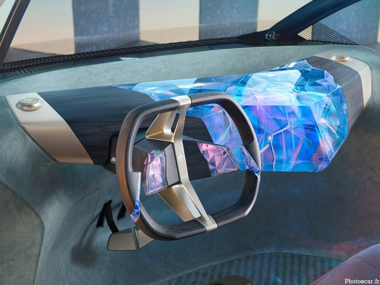 À l’intérieur, la BMW i Vision Circular obtient une cabine de couleur vert menthe avec quatre sièges de salon de couleur lavande. Le constructeur automobile affirme que ces sièges ont_été fabriqués à partir de plastiques recyclés. Il y a un volant imprimé en 3D qui fait à la fois le lien entre le passé et le futur. Egalement équipé d’un éclairage d’ambiance et d’un tableau de bord monobloc avec des éléments en cristal intégrés. Il y a aussi un écran d’information central situé au-dessus du tableau de bord en bas du pare-brise. Cette zone d’affichage porte l’affichage tête haute tel présenté pour la première fois par BMW à un tout autre niveau. Toutes les informations pertinentes sont projetées sur la partie inférieure du pare-brise sur toute sa largeur.