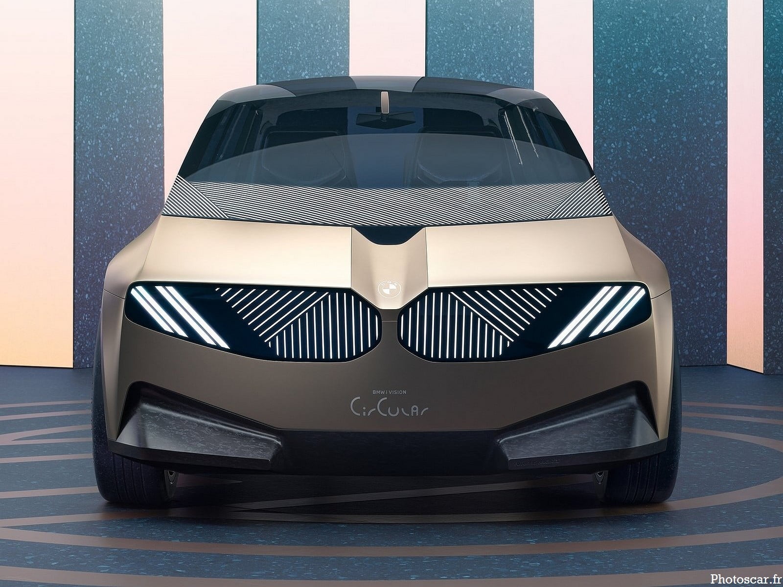 La conception de la circulaire i Vision basée sur quatre principes – Repenser, Réduire, Réutiliser et Recycler. Le concept comprend un corps principal en aluminium secondaire avec une finition anodisée or clair. Il reçoit la calandre caractéristique qui s’étend sur toute la largeur de la partie avant ! et se confond avec les phares. Au lieu d’avoir un contour chromé avec des barres, la calandre nouvellement interprétée comme une surface numérique. Une ligne graphique discrète sur les surfaces rénales constitue le seul élément décoratif de l’extrémité avant. Les surfaces sous le pare-brise sont en aluminium secondaire. Un cluster de capteurs supplémentaire entre les deux éléments rénaux regroupe les caractéristiques technologiques ! permettant un démontage simple au sein d’un seul élément amovible.