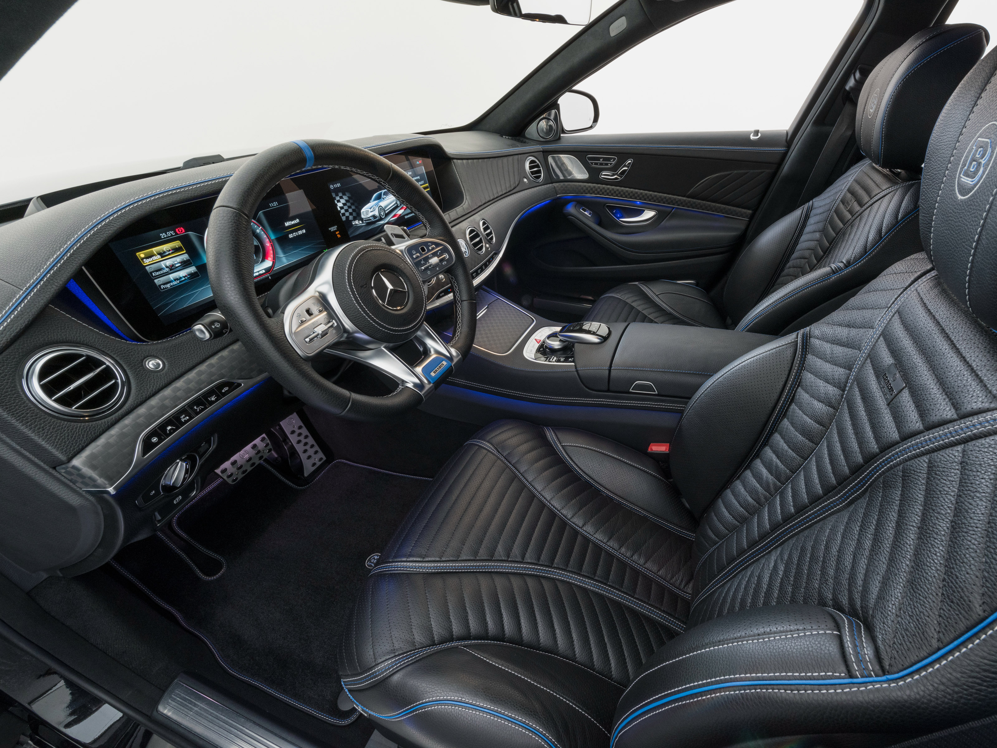 L’intérieure de la 800 S-Class se présente dans une finition sportive en fibre de carbone apparent. Le revêtement à haute brillance, tels que spoiler avant et les pièces jointes de tablier avant et les ailes avant. Le système Keyless Go ouvre automatiquement le Brabus et illumine le logo intégré Brabus et les LED sur la face inférieure des bas de caisse. Sur demande, un éclairage d’ambiance pour l’intérieur avec des couleurs changeantes peutêtre commandé.