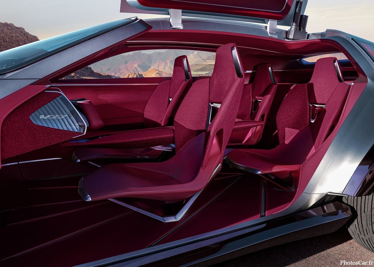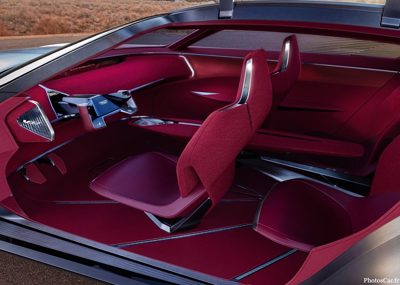 À l’intérieur, c’est du grand art. Cadillac a mis le paquet sur les matériaux nobles : cuir Nappa rouge intense, tissus bouclés grenat, éclairage adaptatif. Le volant et les pédales peuvent se rétracter pour laisser place à un espace de détente. Oui, tu peux littéralement faire une séance de respiration guidée pendant que la voiture roule en mode autonome. Les sièges intègrent des lumières infrarouges pour la récupération musculaire. Et l’air est filtré, parfumé, climatisé selon ton humeur. C’est un vrai cocon technologique. Le design intérieur joue sur les contrastes : rouge flamboyant contre bleu glacier. Les formes sont épurées, les sièges semblent flotter. On est loin du tableau de bord classique. Ici, tout est pensé pour le bien-être et la performance. Même les animations visuelles sur le volant sont inspirées du sable en mouvement. Cadillac veut que tu te sentes ailleurs. Et franchement, ça fonctionne.