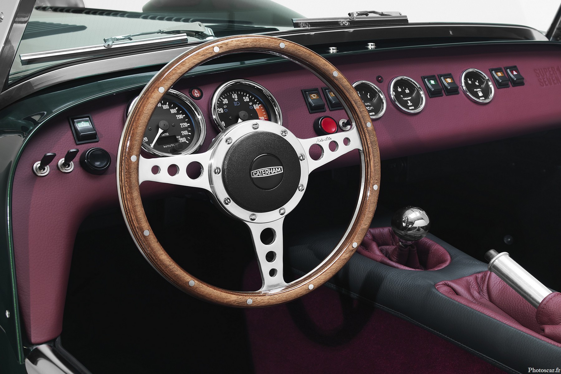 La sensation rétro se poursuit à l’intérieur (pouvez-vous appeler la cabine d’une Caterham «à l’intérieur»?). Avec des sièges en cuir «de coupe classique» et un tableau de bord garni de cuir. Le volant garni de bois est également une belle touche.