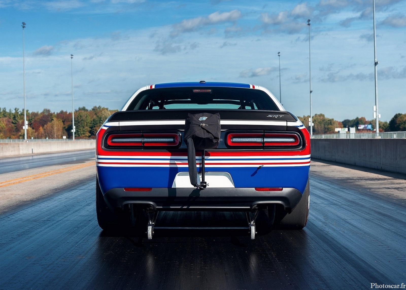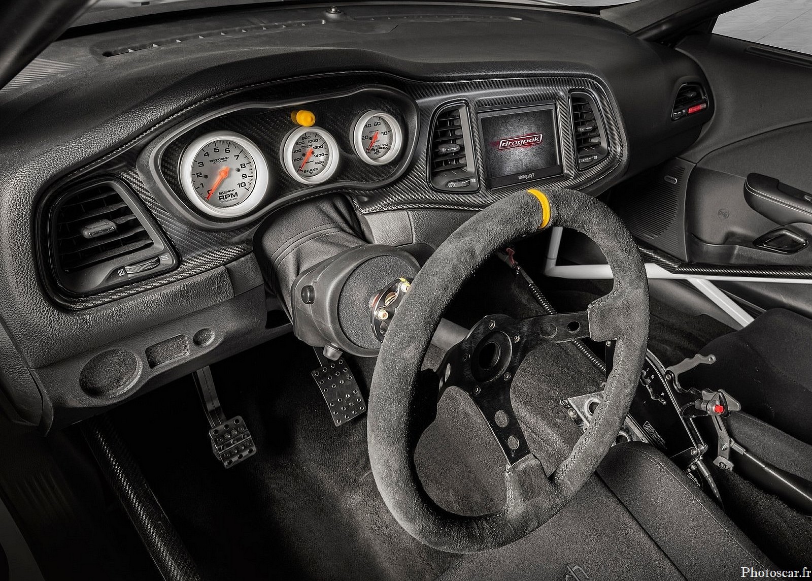 À l’intérieur se trouve une nouvelle cage de protection certifiée NHRA à 7,5 secondes au quart de mile. Le tableau de bord est également unique à la voiture et comprend; une lunette en fibre de carbone avec trois jauges primaires (régime, pression de freinage et pression d’huile). De plus, un tableau de bord numérique Holley EFI avec un écran tactile couleur de 7,0 pouces à faible éblouissement (pour modifier les paramètres du véhicule) se trouve à l’endroit où se trouve normalement l’écran d’infodivertissement du Challenger.