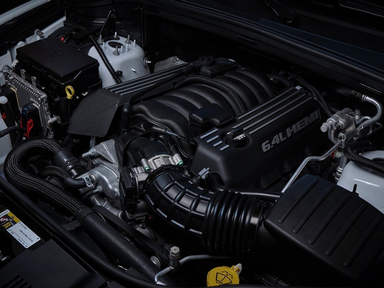 l’inspiration vient des SRT Hellcat, avec un faciès énigmatique marqué par les prises d’air vierges de tout logo ou chrome habituel. Le capot bizarre héberge trois ouïes. La caisse est rabaissée et de nouvelles jupes latérales agrémentent la silhouette.