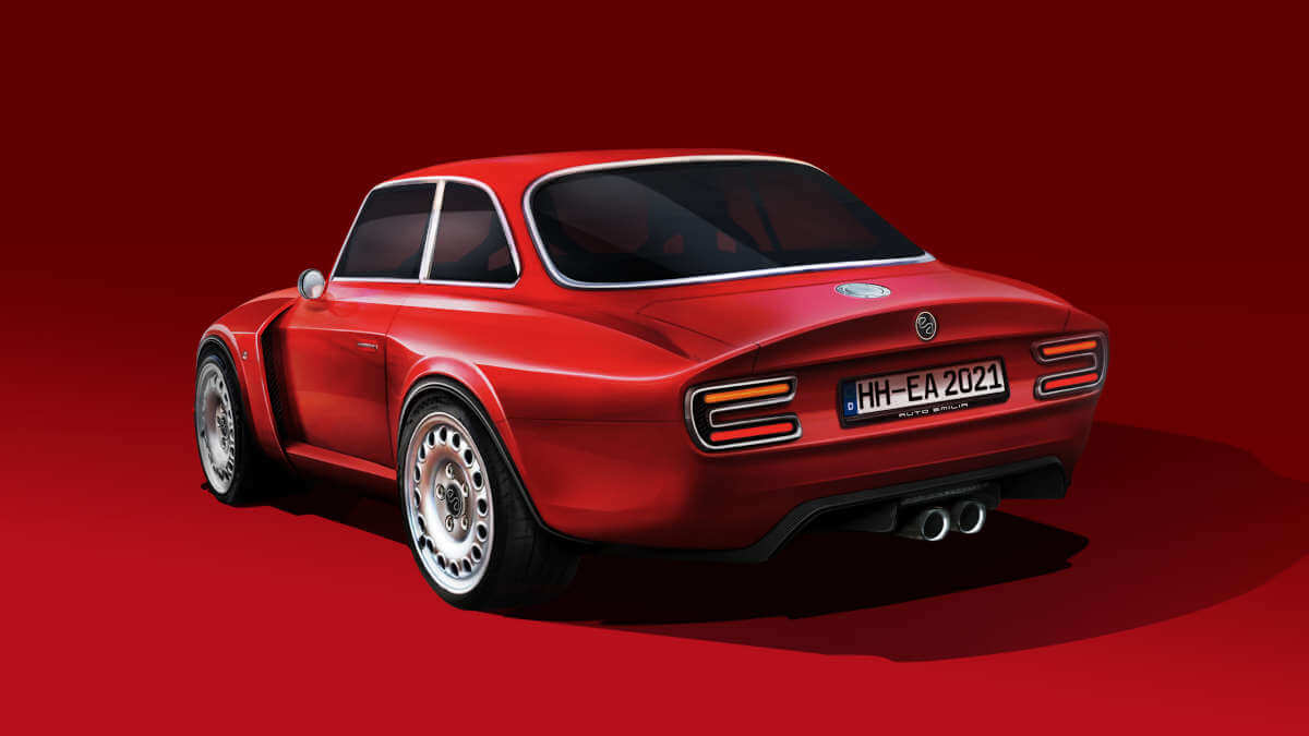 Pour créer la voiture, Emilia Auto prend une Alfa Romeo Giulia GT d’origine. Il met à jour de manière complète la carrosserie, puis l’associe au nouveau cadre spatial et au nouveau groupe motopropulseur. En parlant de design, il a été_amélioré et comprend des arches évasées! un capot sur mesure pour abriter le nouveau moteur et des feux avant et arrière plus modernes. Il y a aussi deux sorties d’échappement centrales et un becquet à lèvre incurvé. É