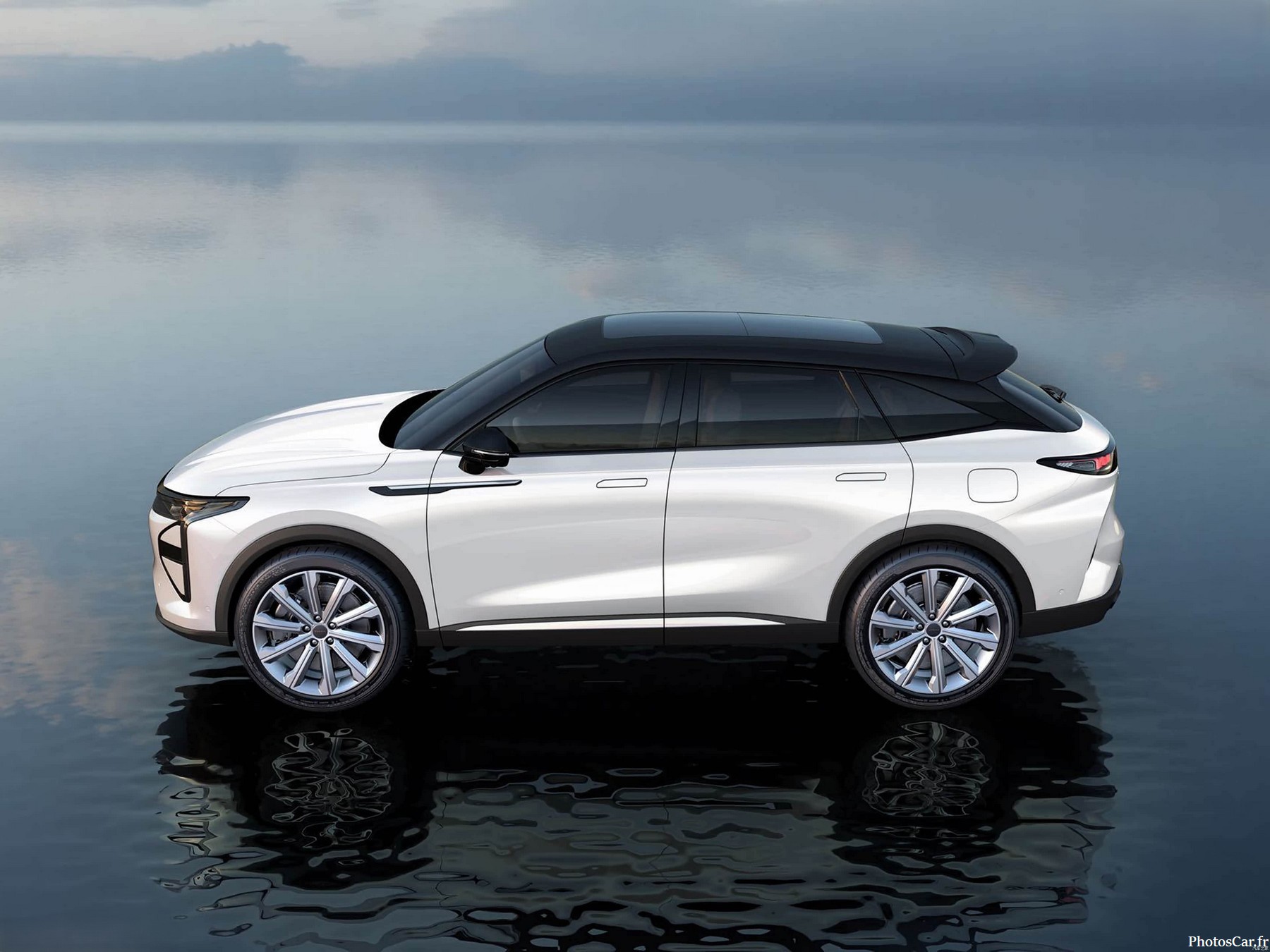 Le design extérieur du Exeed Yaoguang C-DM 2025 joue la carte de l’élégance dynamique. Sa silhouette de 4,78 mètres de long repose sur une large base de 2,81 mètres, ce qui lui confère une belle prestance. À l’avant, les phares LED affûtés encadrent une calandre trapézoïdale fermée, soulignée par des bandes lumineuses verticales. Le capot sculpté et les lignes de caisse anguleuses renforcent son allure musclée. Le toit noir contraste avec la carrosserie bicolore, ajoutant une touche de sportivité. À l’arrière, les feux traversants et les sorties d’échappement dissimulées donnent une impression de pureté et de modernité. Les jantes de 20 pouces parachèvent ce look racé. Ce SUV ne cherche pas à être excentrique, mais à imposer une présence premium sans fioritures. Et ça fonctionne.