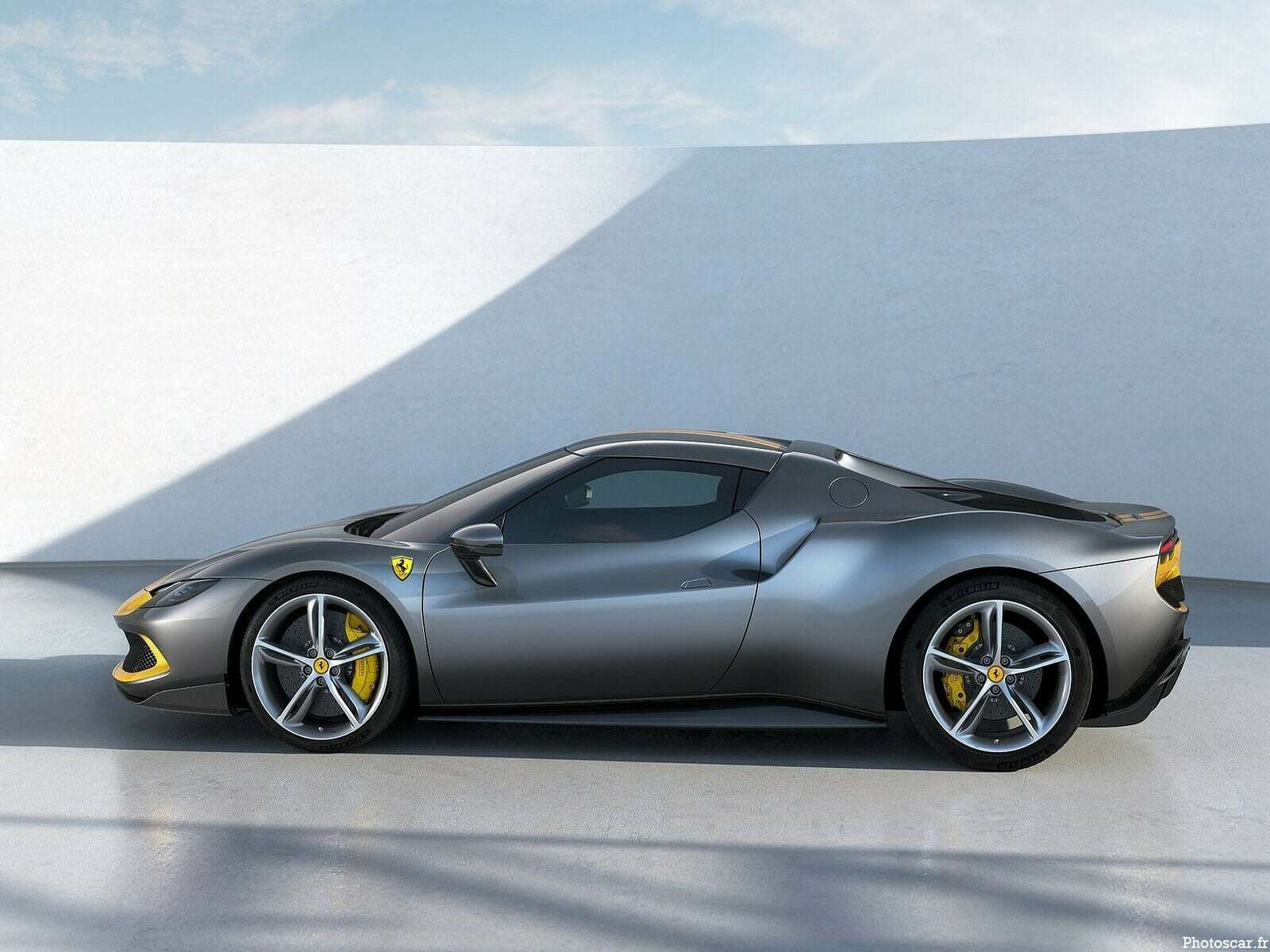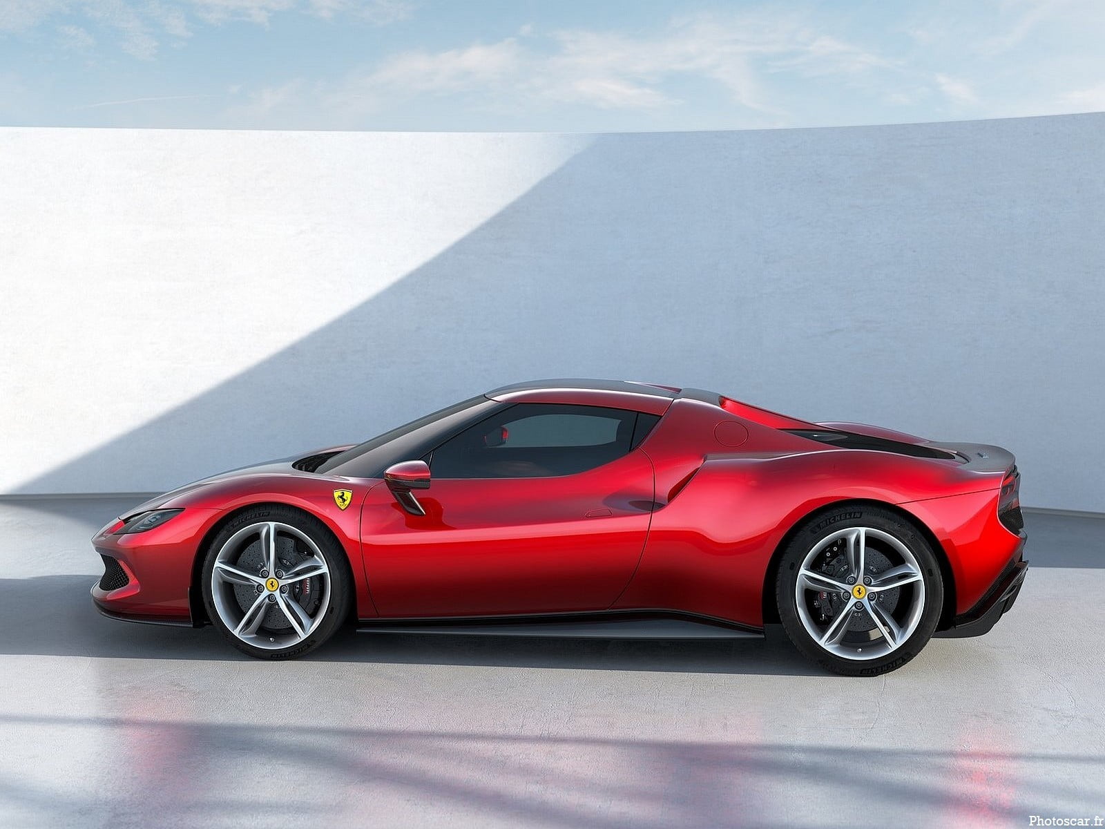 Dès lors, cette nouvelle Ferrari à moteur central arrière abandonne le traditionnel V8. Elle profite d’un V6 2.9 biturbo qui s’ouvre à 120° avec des turbos intégrés au cœur du V. Elle se veut plus légère de 30 kg que le V8 de la F8 Tributo. Ce moteur n’a rien de commun avec le V6 Nettuno conçu par Maserati pour le MC20. Il développe 663 ch (221 ch/l et convertit à 8500 tr/min) ! et associé à un moteur électrique de 167 ch et 315 Nm. 830 ch combinés pour un rapport poids/puissance de 1,77 kg/ch avec une masse sèche de 1470 kg.