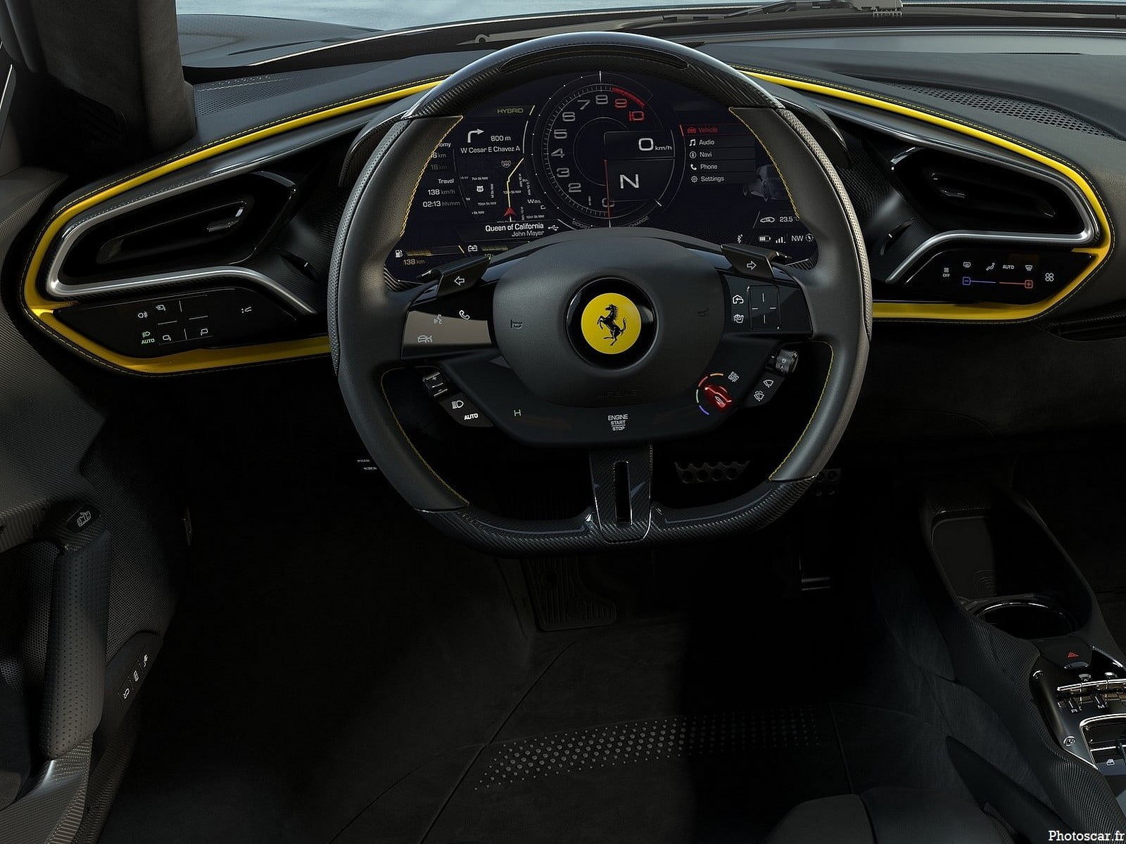 À l’image de l’extérieur, Ferrari choisit un environnement simple et épuré pour l’intérieur de sa berlinette. Basée là aussi sur l’habitacle de la SF90! la planche de bord de la 296 GTB reçoit deux écrans, un pour l’infodivertissement et une grande dalle pour l’instrumentation. La firme italienne porte toujours une grande attention aux détails choisis pour les panneaux de portes. Elle soigne aussi les sièges avec des jolies surpiqûres !