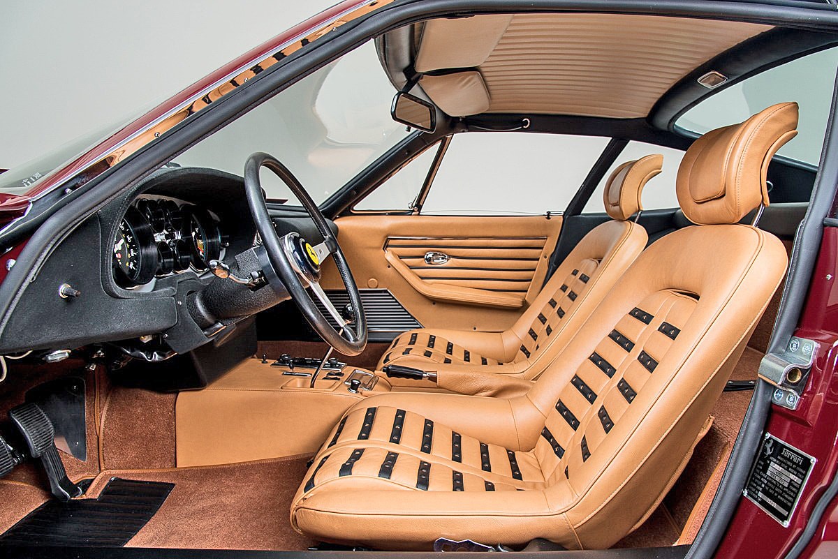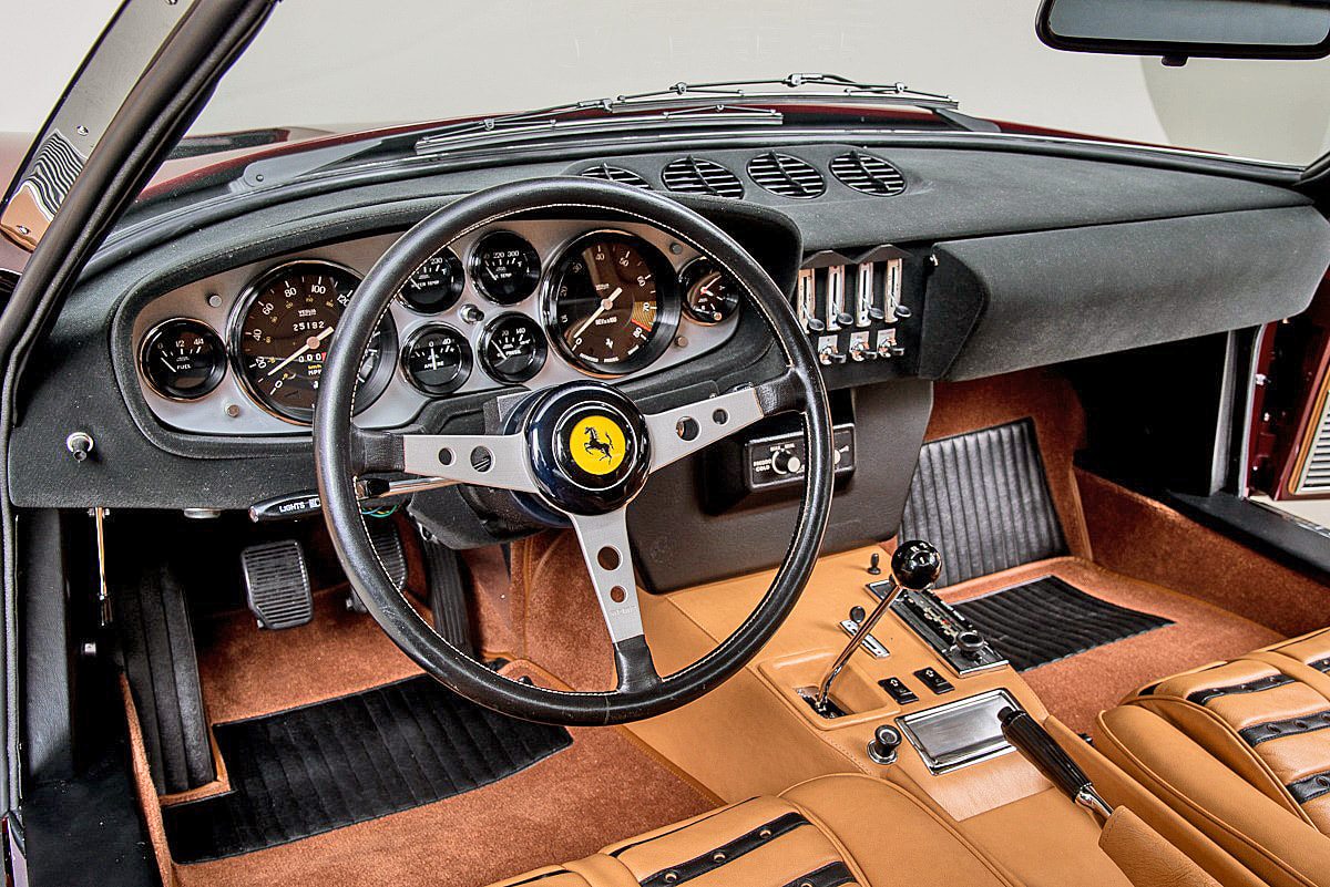 L’habitacle de la Ferrari 365 GTB/4 Daytona 1972 est un mélange parfait entre confort et fonctionnalité. Le tableau de bord, résolument orienté vers le conducteur, regroupe des instruments analogiques précis et lisibles. Les sièges en cuir, élégamment matelassés, offrent un confort exceptionnel même lors des trajets les plus longs.