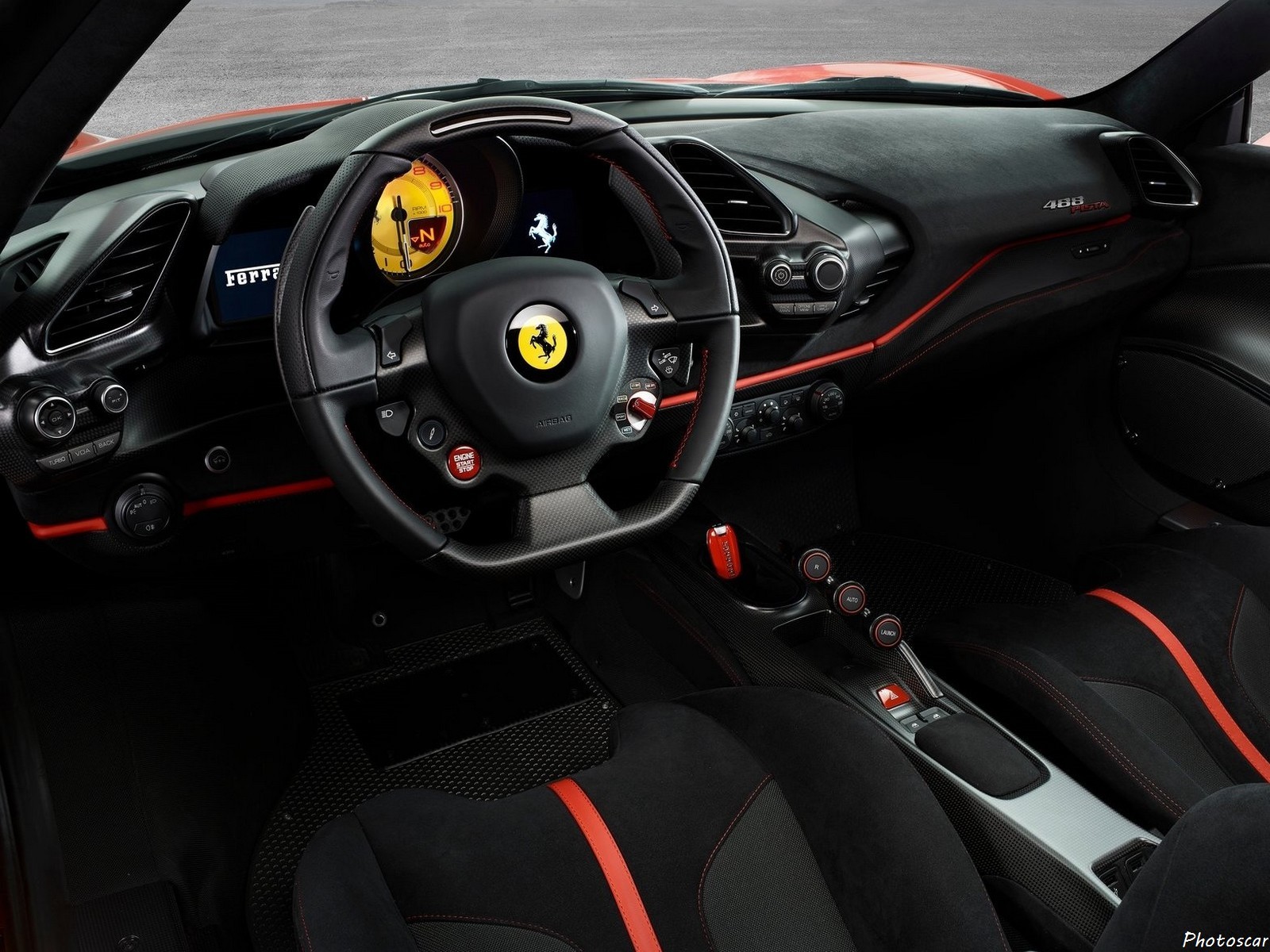 Le poids total du véhicule a été réduit de 90 kg, pour un poids total sec de 1280 kg. Cela en partie grâce aux pare-chocs en fibre de carbone, au capot moteur en fibre de carbone et aux roues en fibre de carbone de 20 pouces. La fibre de carbone est également le matériau de choix pour la grande aile arrière, qui, avec les canaux d’air et le diffuseur arrière améliorés, ainsi que le diffuseur et les diffuseurs S avant dérivés de la course, aide la Ferrari 488 Pista à générer 20% d’appui le GTB.