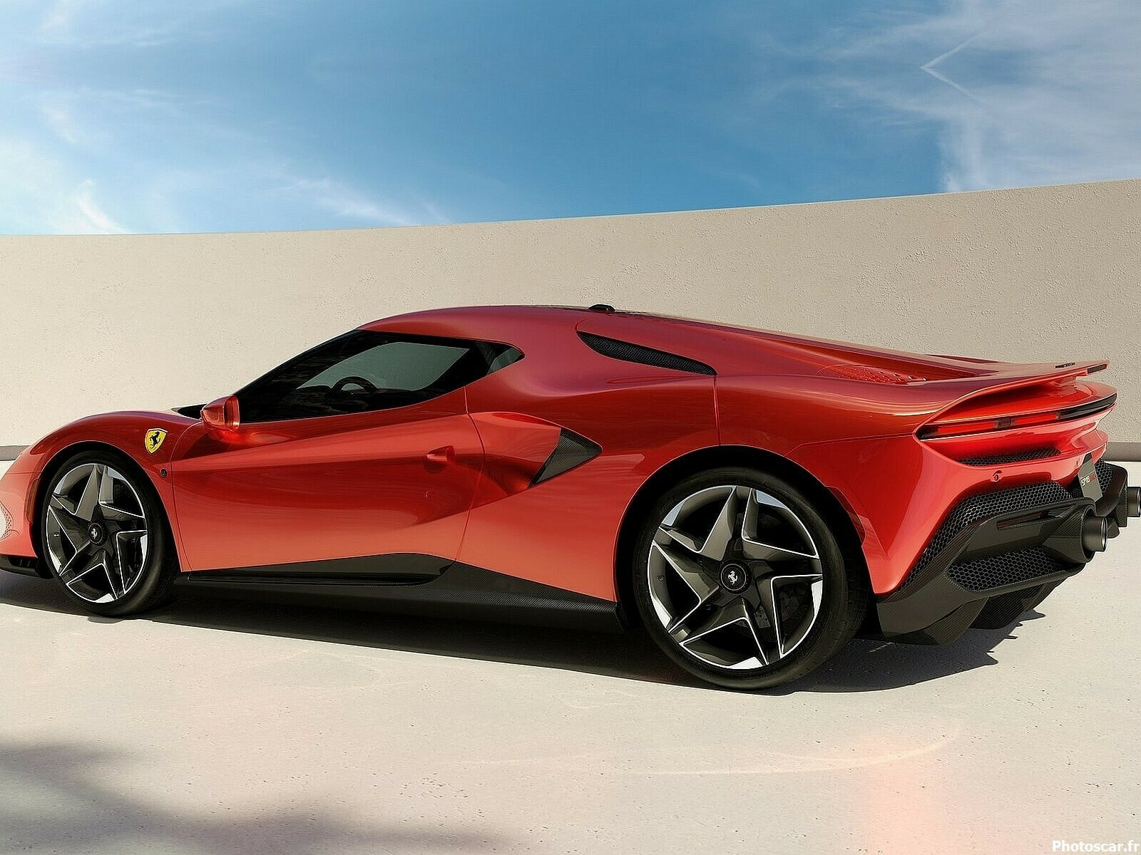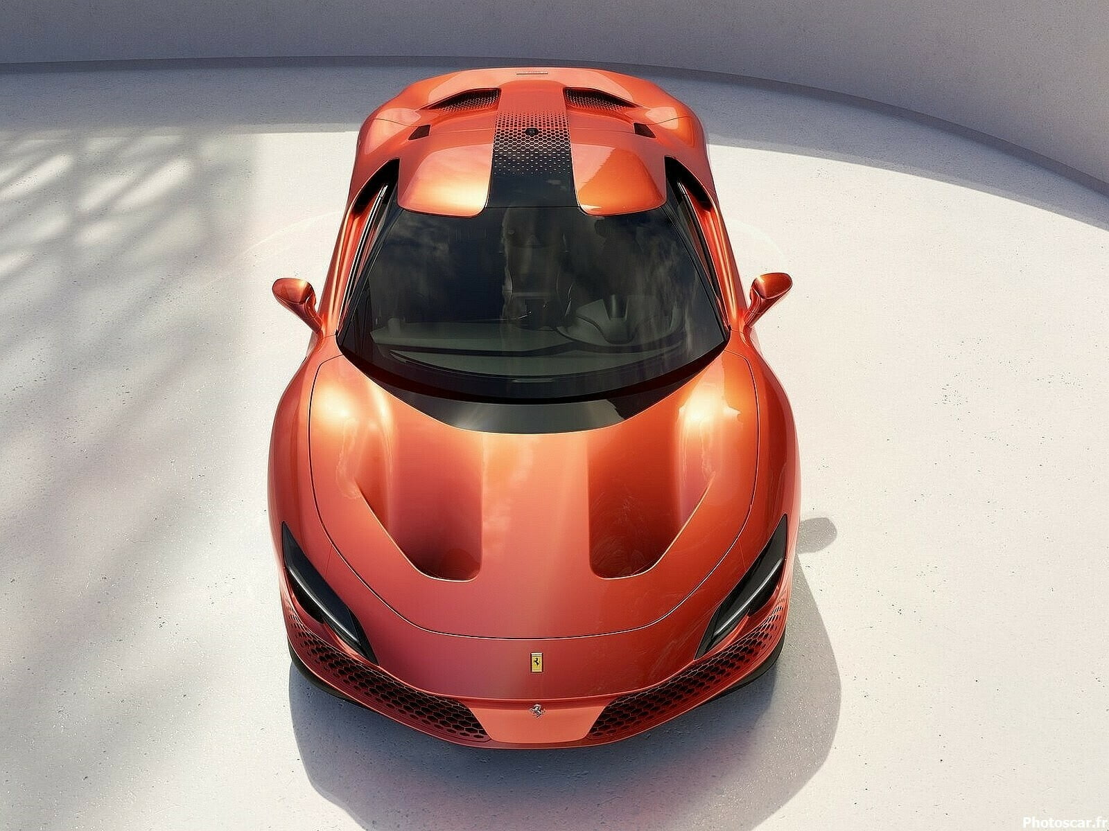 La forme des vitres évoque celle d’une visière de casque. Une idée déjà introduite sur les P80/C et 296 GTB! accentuée ici par l’absence de vitres de custode mais aussi de lunette arrière. Au lieu de cela, un dégradé du noir au rouge relie le pare-brise au capot moteur. Cela reprend visuellement le maillage des entrées d’air. Les écopes installées derrière les vitres latérales permettaient de réduire la taille des ouïes placées devant les roues arrière. L’absence de lunette accentue également la largeur de la poupe, d’ailleurs mise en valeur par les fins feux horizontaux. Le porte-à-faux arrière est plus long que celui de la F8 Tributo, au bénéfice des performances aérodynamiques de la voiture.