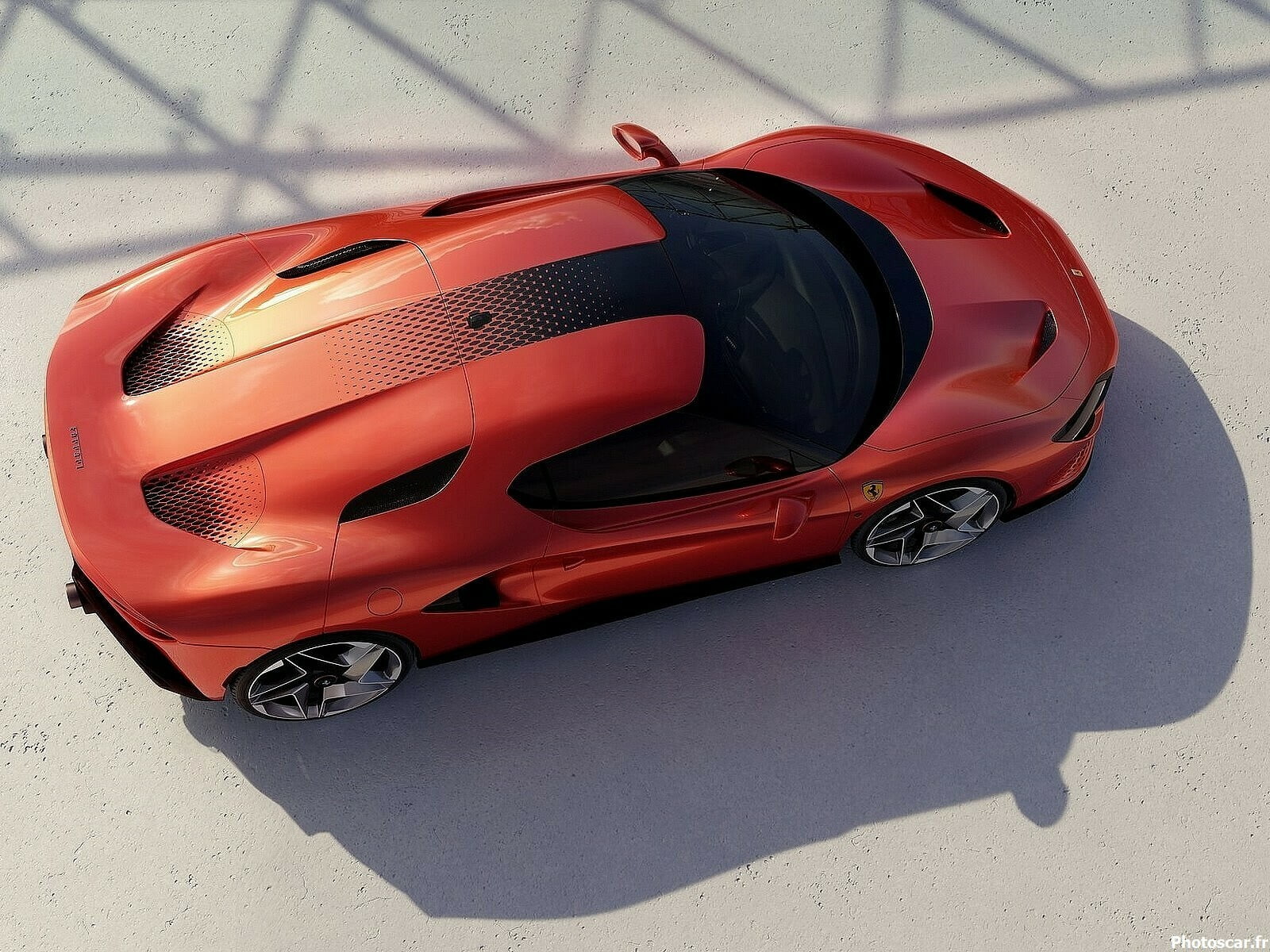 La partie avant du SP48, qui peut évoquer une flèche, rappelle immanquablement celle du SF90. Elle a des feux au regard acéré accolés aux prises d’air. La grille d’aération du pare-chocs avant a été conçue à l’aide d’une modélisation procédurale. Elle est semblable à celles sous le becquet arrière. Cette conception utilise des algorithmes. Le résultat est un design dans le même style que la calandre de la Roma. Les ouvertures sont de tailles différentes. Elles sont encore plus organiques.