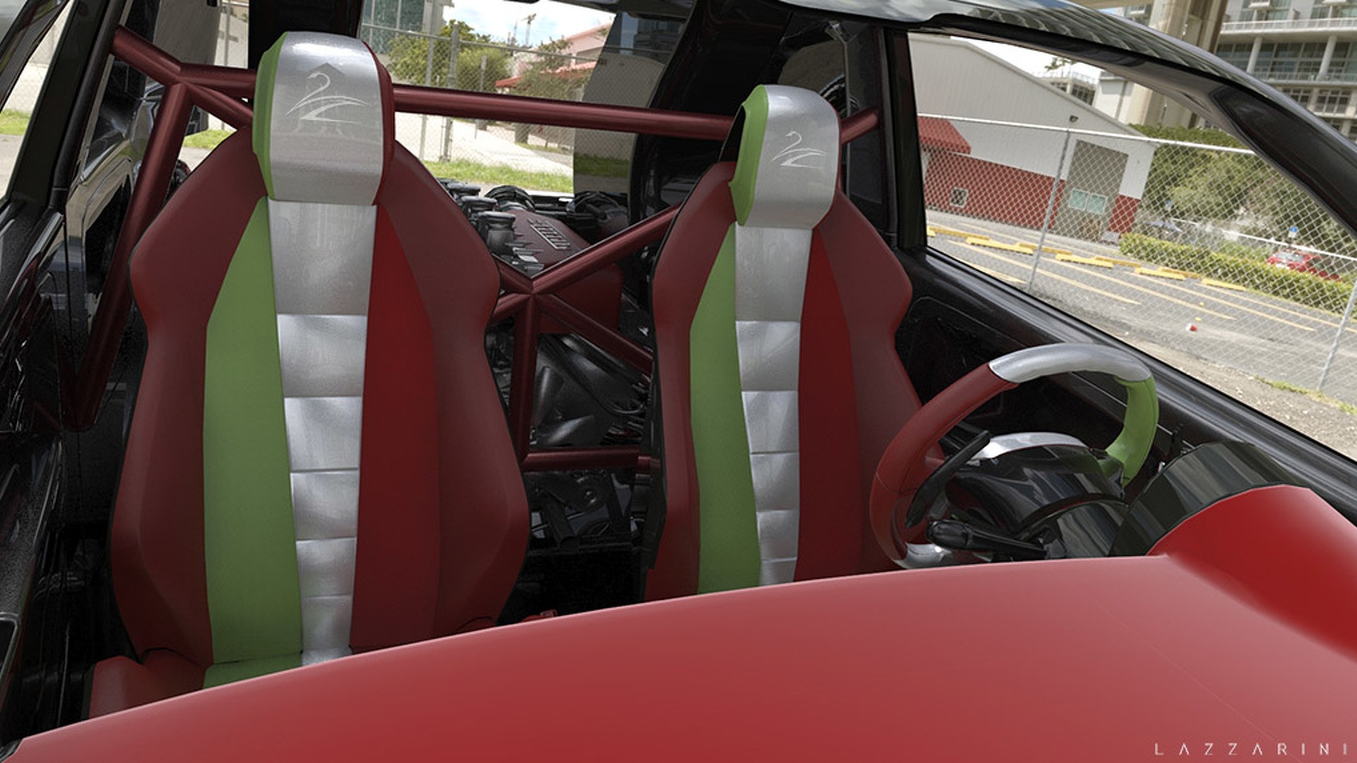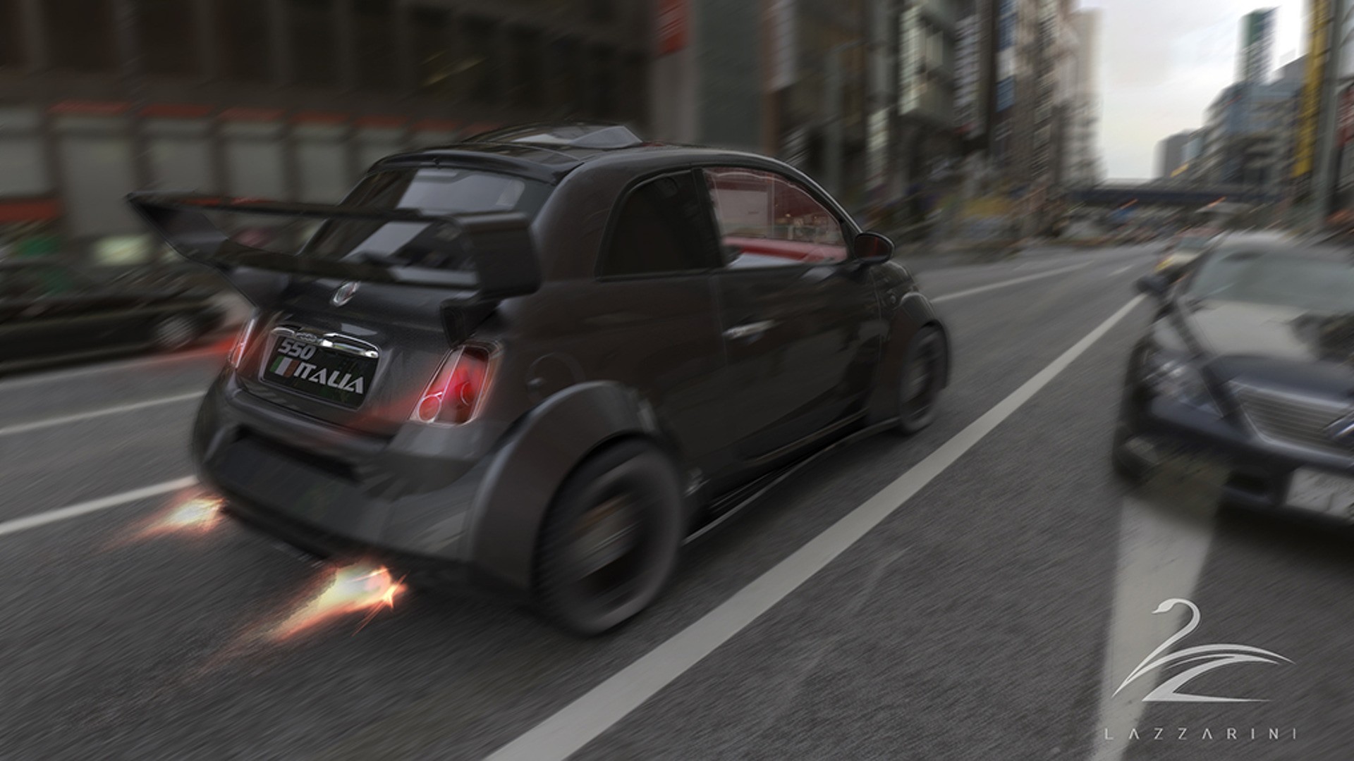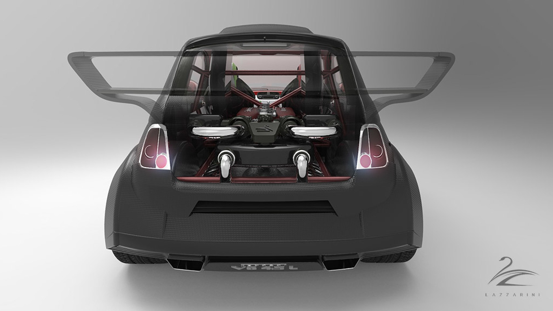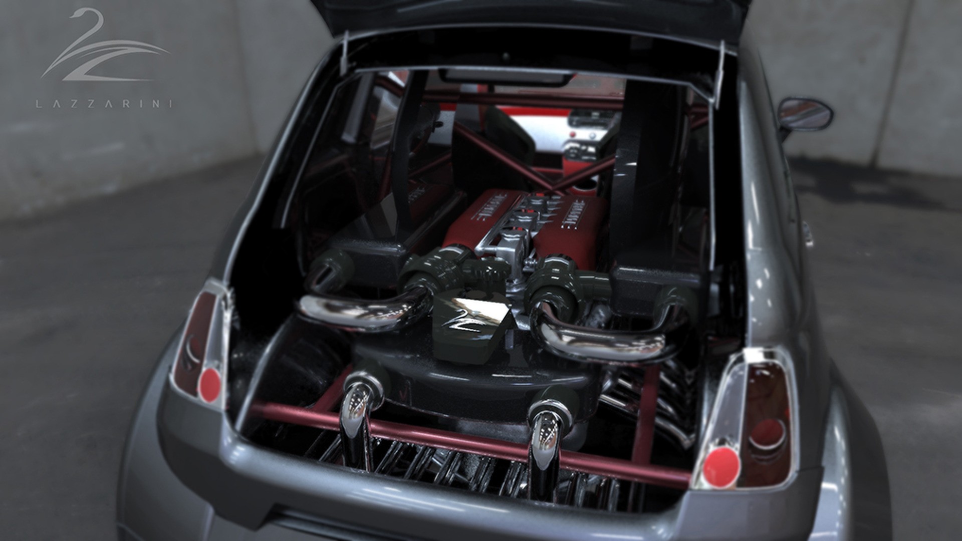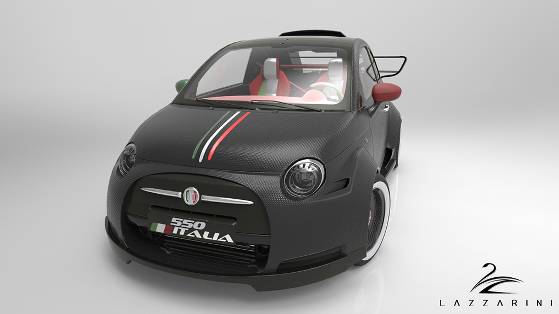 Heureusement, la Fiat 550 Italia Lazzarini n’est_qu’un exercice de conception dans le monde de la CAO virtuelle. Aucun 500 réel n’a_été blessé dans la fabrication de ce monstre. La firme dit qu’il en coûterait, par coïncidence, 550 000 USD pour en produire un dans la vie réelle. Site officiel Lazzarini