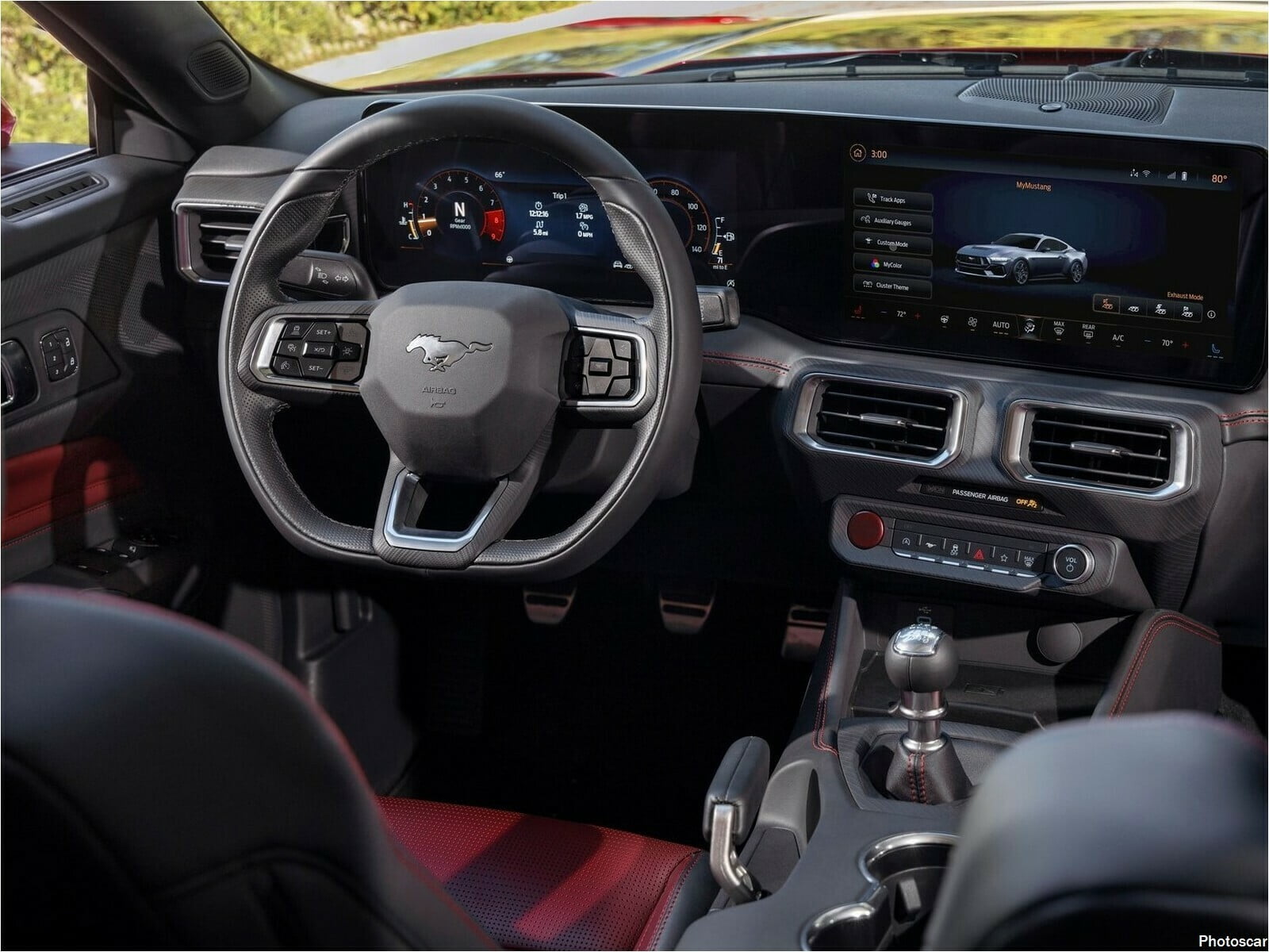 Ford vante les mérites du cockpit entièrement repensé et centré sur le conducteur de la nouvelle Mustang. Il dispose d’un écran de groupe de jauges numériques personnalisable en option avec des graphiques mis à jour qui sont 0,4 pouces plus grands que ceux du modèle précédent. Il y a aussi un écran tactile disponible qui est plus de cinq pouces plus grand que l’écran de mise à niveau sortant ! et lorsqu’ils sont achetés ensemble, les deux écrans sont assis dans un boîtier incliné vers le conducteur.