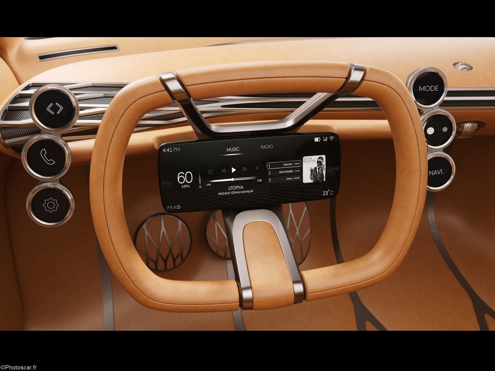 Le volant oblong dispose de son propre écran intégré et est entouré de six écrans supplémentaires. Il est difficile de ne pas regarder cette configuration et de penser aux concept-cars de la start-up chinoise Byton , qui placent également des écrans dans le volant. Mais il n’est pas clair si cette approche serait réellement plus facile à utiliser dans le monde réel, ou si les concepteurs essayent simplement de montrer à quel point ils réussissent à intégrer des écrans dans des tableaux de bord de voiture.