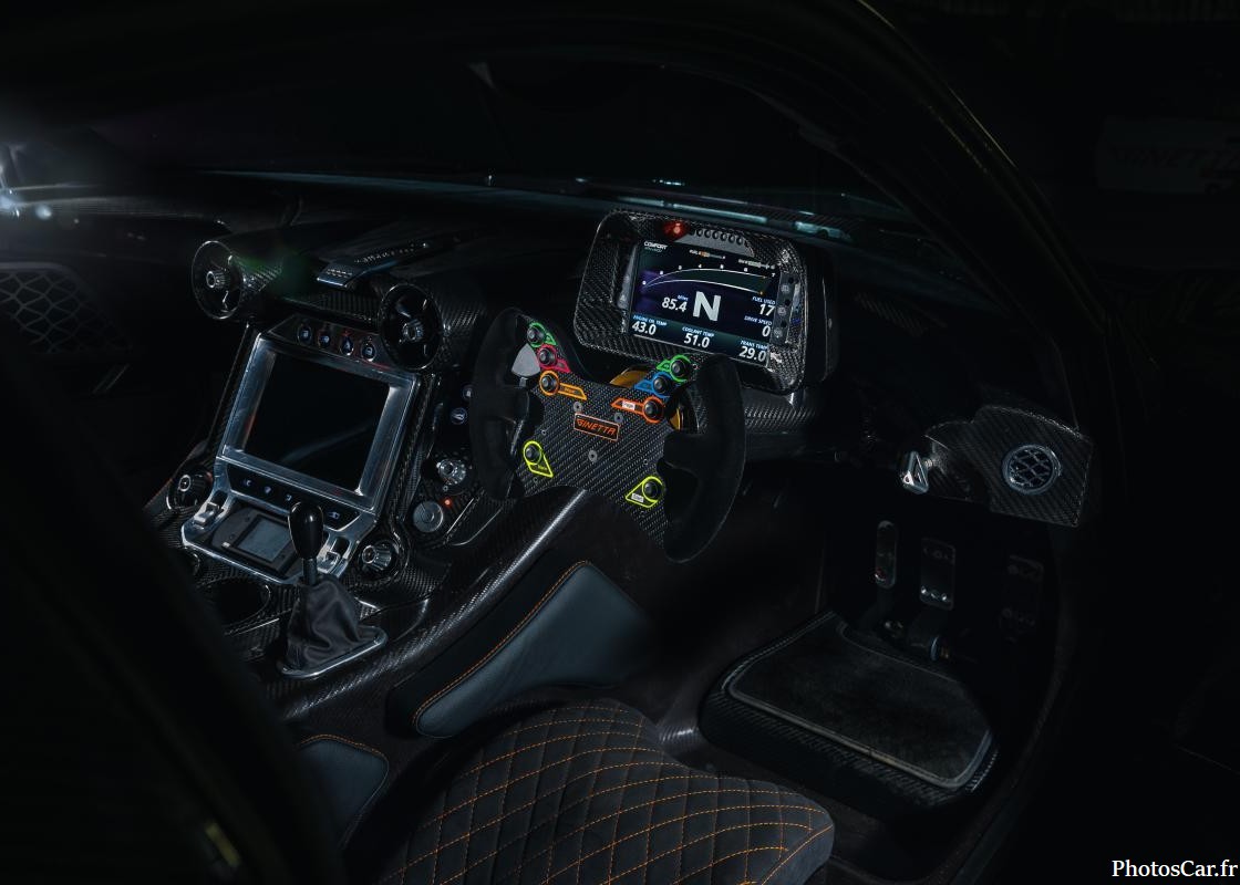À l’intérieur, la Ginetta Akula 2025 mise sur le sport. Elle ne sacrifie pas le confort. Un habitacle est pensé pour le pilote. Les sièges sont moulés dans le châssis en carbone, avec un rembourrage personnalisé pour chaque conducteur. Le volant multifonction en fibre de carbone, directement inspiré de la compétition, donne accès aux réglages essentiels. L’instrumentation est numérique, avec un système d’infodivertissement développé par Ginetta, compatible iOS et doté de la recharge sans fil. Les finitions en aluminium usiné et les inserts en carbone apportent une touche de luxe discret. Même les pédales et la colonne de direction sont ajustables électriquement. En résumé, c’est un cockpit de course avec juste ce qu’il faut de technologie pour la route.