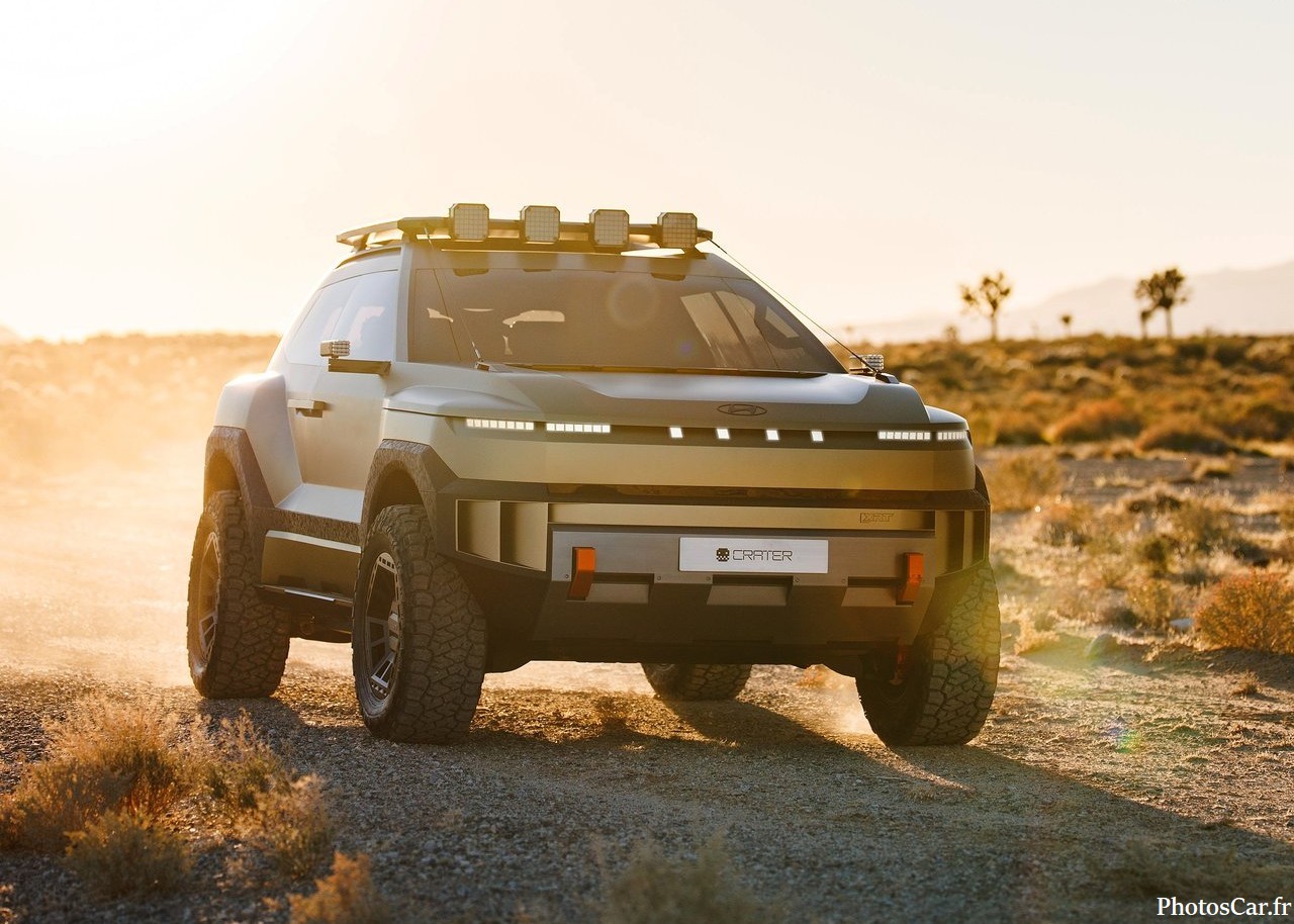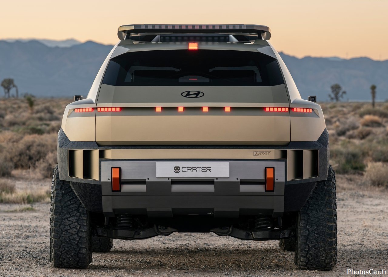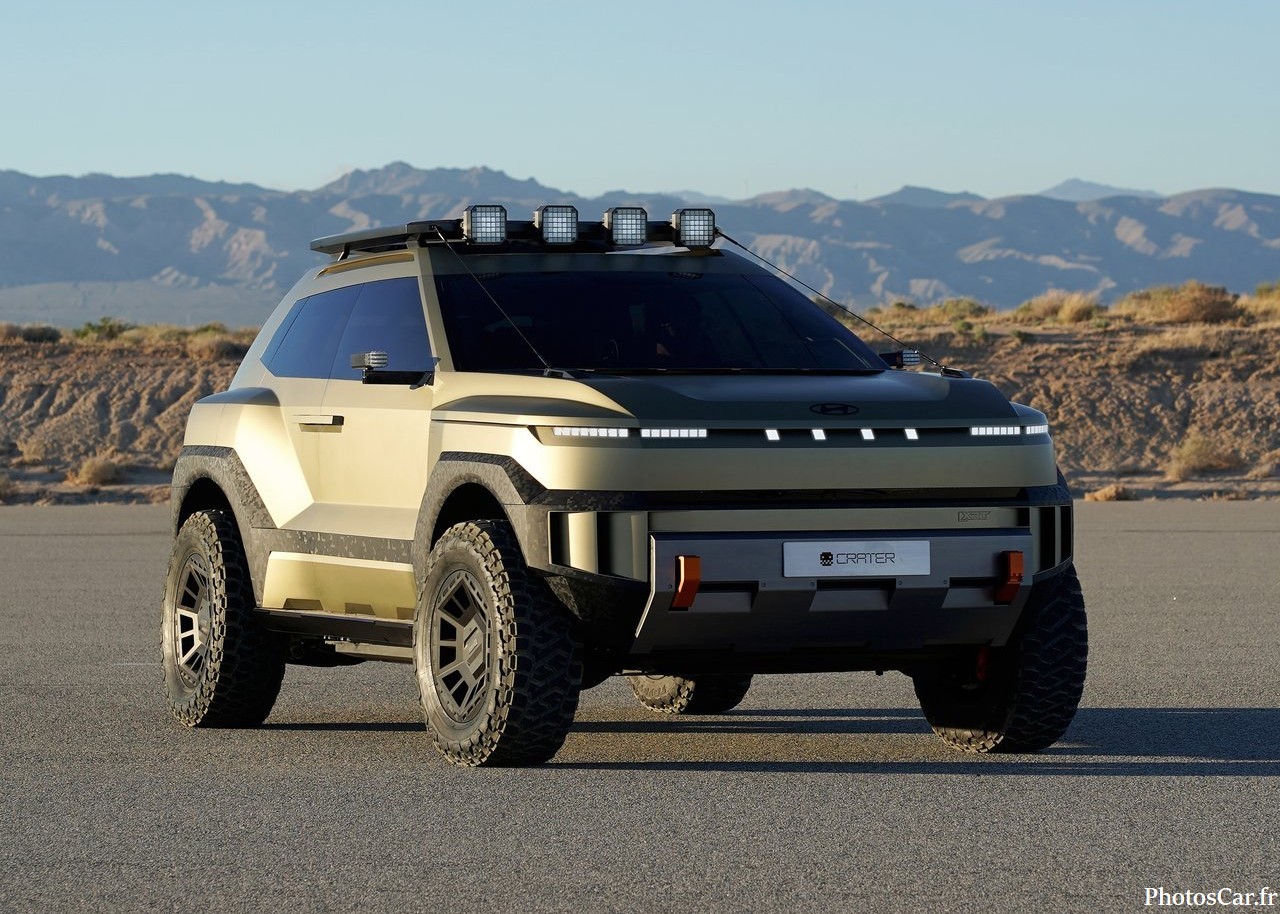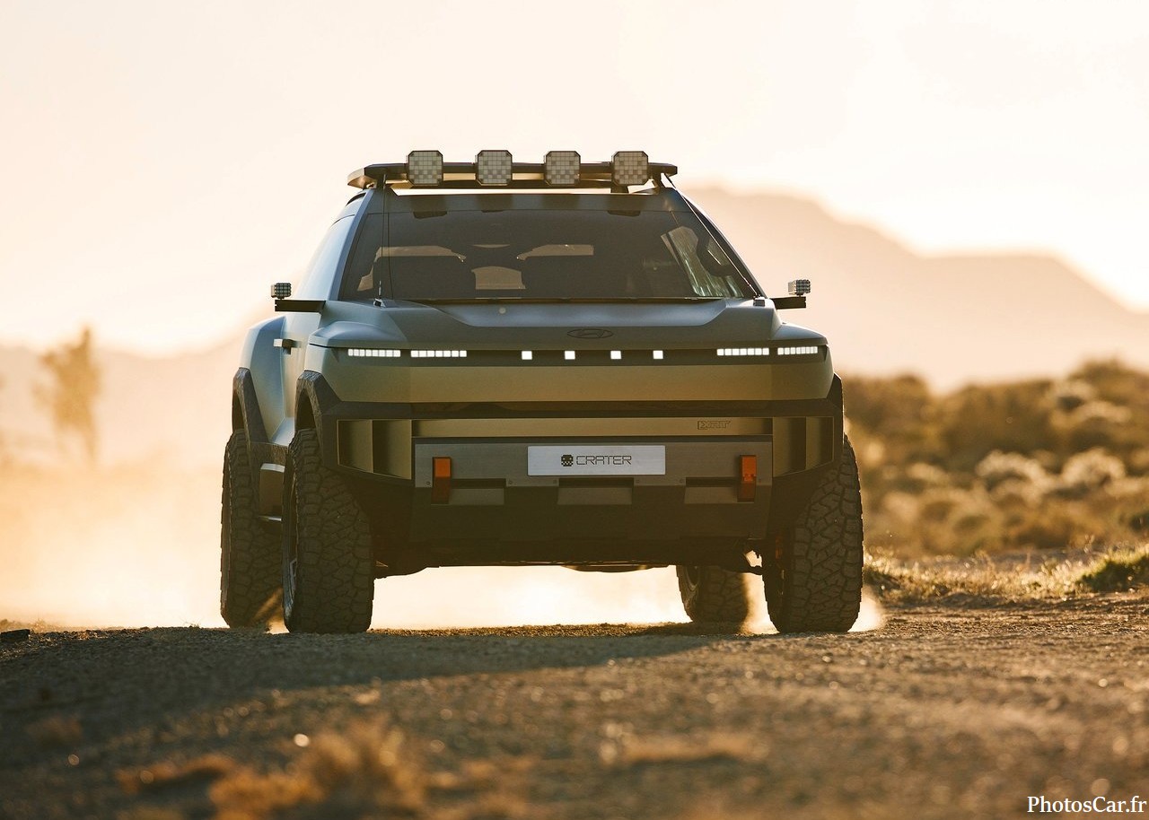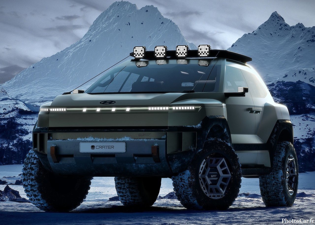 Le look du Crater est immédiatement saisissant. C’est vrai qu’on ne voit ça nulle part ailleurs. On adore ses lignes très anguleuses et fortes. Les phares LED ultra-fins sont super modernes. La calandre est presque inexistante. Elle est remplacée par un panneau noir brillant. Cela souligne son côté électrique assumé. De plus, la garde au sol est assez haute. Cela lui donne un air très robuste. Les jantes spécifiques au concept sont géantes. Elles ont un design vraiment futuriste. En fait, chaque détail est pensé. Le toit flottant noir contraste bien avec la carrosserie vive. Il y a des protections de bas de caisse costauds. On sent qu’il est prêt pour toutes les routes. Cela prouve l’esprit d’aventure de Hyundai. Le design extérieur est une réussite totale.