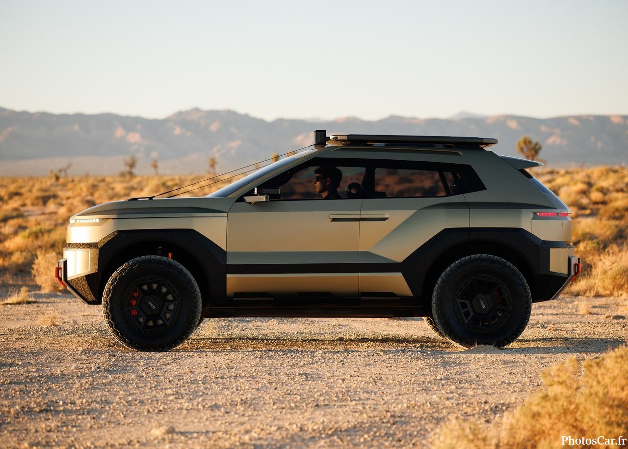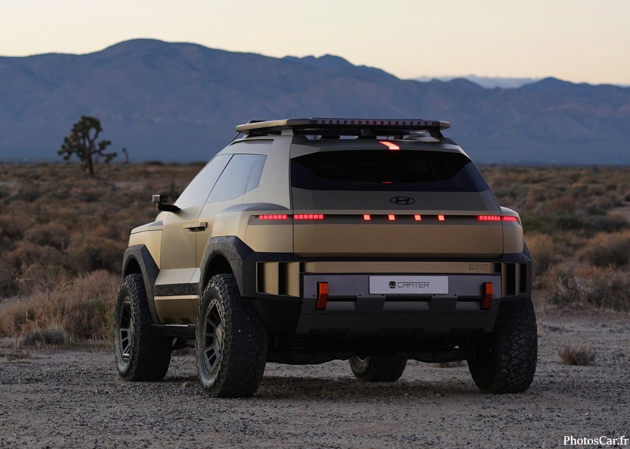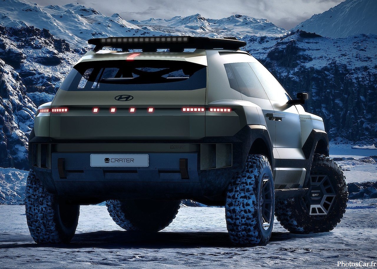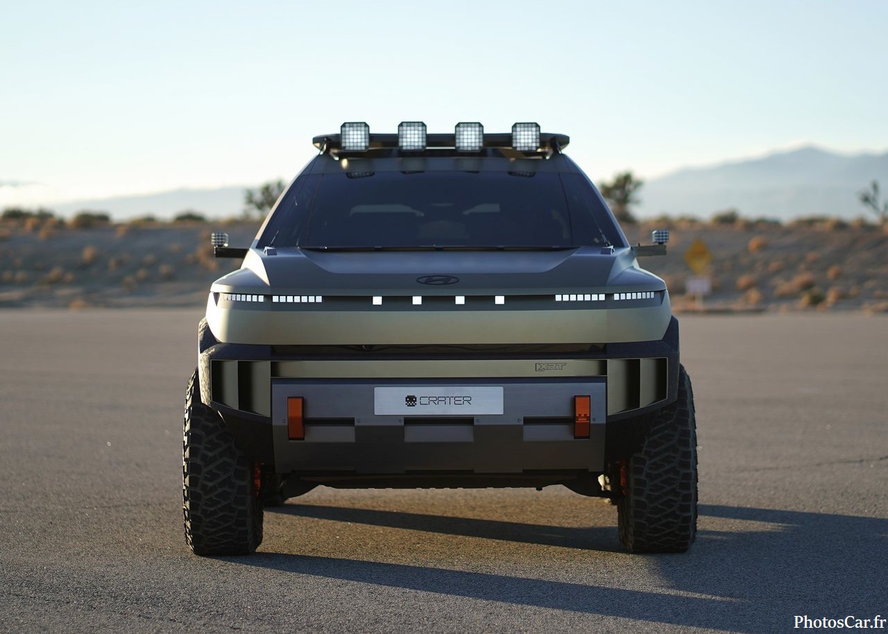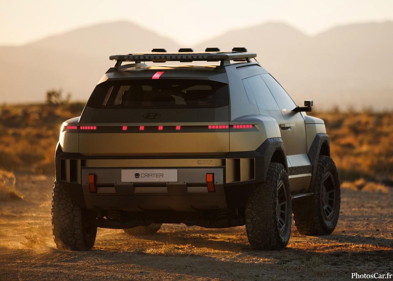 Le look du Crater est immédiatement saisissant. C’est vrai qu’on ne voit ça nulle part ailleurs. On adore ses lignes très anguleuses et fortes. Les phares LED ultra-fins sont super modernes. La calandre est presque inexistante. Elle est remplacée par un panneau noir brillant. Cela souligne son côté électrique assumé. De plus, la garde au sol est assez haute. Cela lui donne un air très robuste. Les jantes spécifiques au concept sont géantes. Elles ont un design vraiment futuriste. En fait, chaque détail est pensé. Le toit flottant noir contraste bien avec la carrosserie vive. Il y a des protections de bas de caisse costauds. On sent qu’il est prêt pour toutes les routes. Cela prouve l’esprit d’aventure de Hyundai. Le design extérieur est une réussite totale.