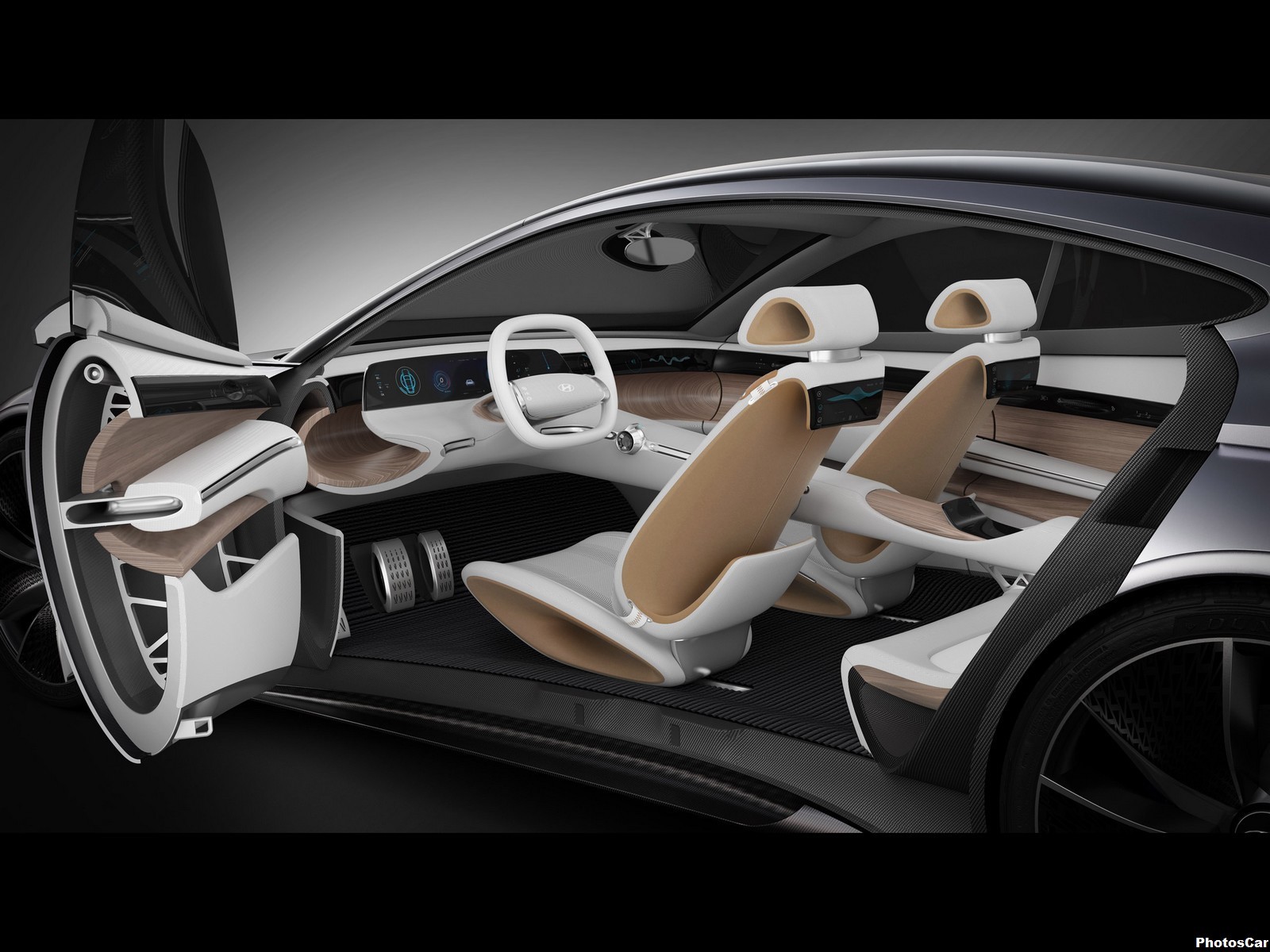 L’intérieur de la voiture utilise une «architecture enveloppante» mettant l’accent sur la profondeur. Cela vise à créer un environnement de voyage spacieux et confortable pour les passagers. Le bois revitalisé et les tissus de haute technologie sont_sculptés dans la conception du véhicule. Cela en profitant des dernières technologies en matière de design. Un écran panoramique ‘flottant’ frappant utilisant la technologie haptique présente au conducteur l’accès à un ‘cockpit’ intuitif.