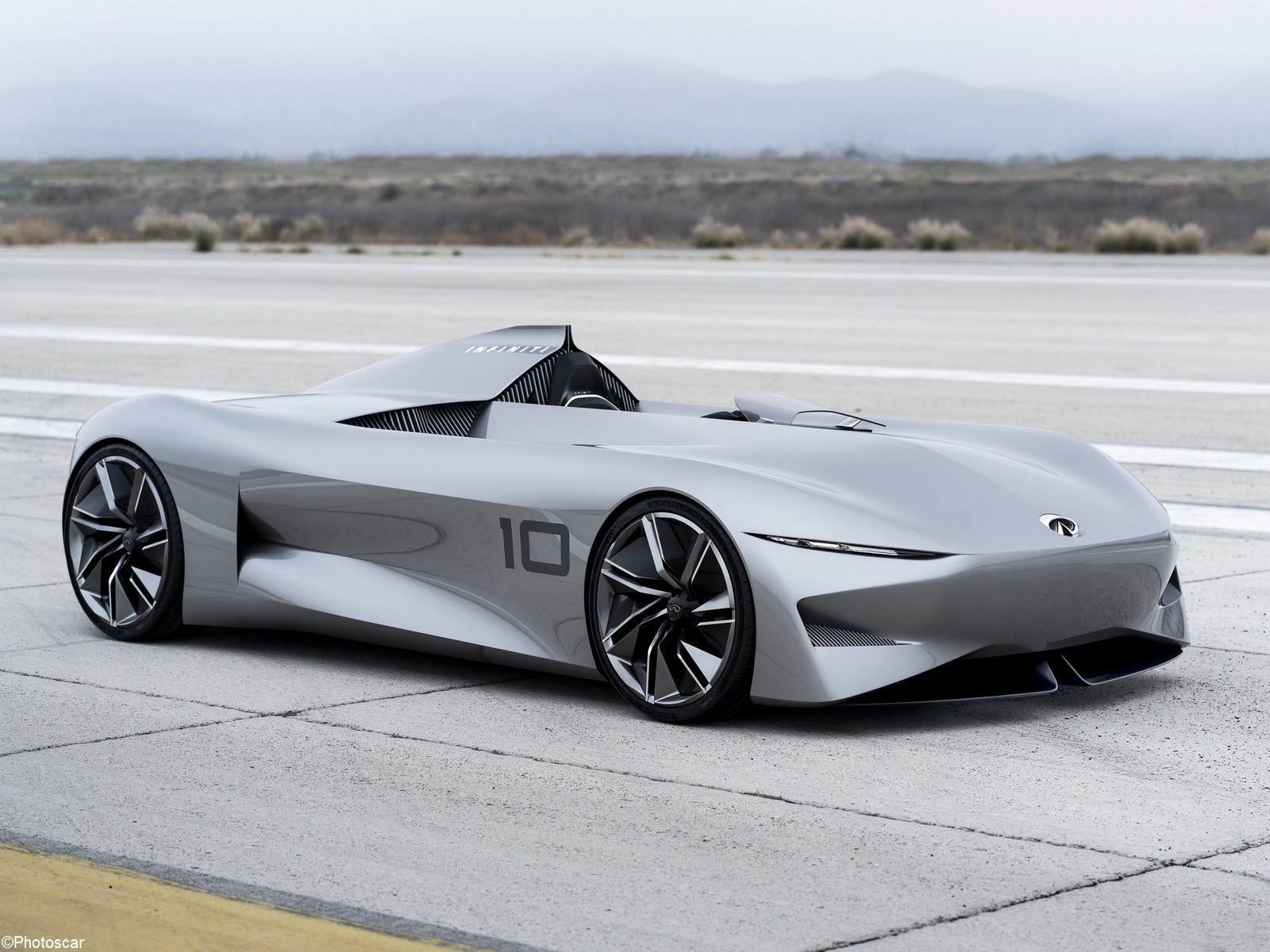 La forme générale de l’Infiniti Prototype 10 rappelle les voitures de course classiques telles que la Jaguar des années 1950. Types C et D. Par ailleurs il n’y a pratiquement aucune protection contre le vent pour le passager seul. Aussi il existe un appuie-tête bien visible qui intègre un élément aérodynamique en forme d’ailette. Les prises d’air sont abondantes et décorées de barres verticales rapprochées. Celle-ci nous rappellent le concept Prototype 9 de l’année dernière.