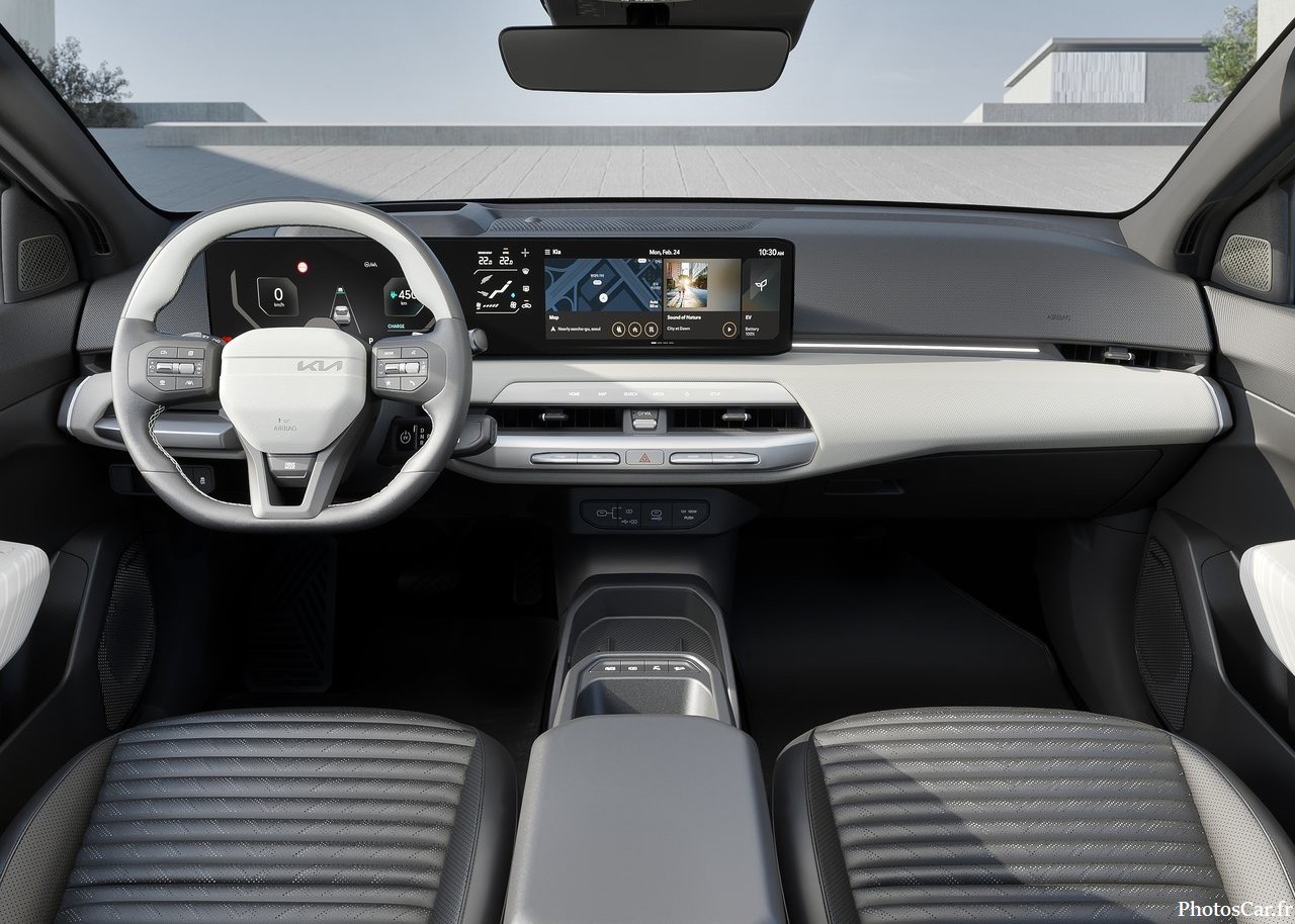 À l’intérieur, la Kia EV4 2026 mise sur l’épure et la technologie. Le volant à deux branches donne le ton : minimaliste mais stylé. Le sélecteur de vitesse est intégré à la colonne de direction. Résultat : plus de place, plus de fluidité. L’éclairage d’ambiance s’adapte à ton humeur. Lumières douces, faisceaux ciblés, séquences dynamiques… C’est intelligent et immersif. Le volume de coffre atteint 435 litres, un record dans la catégorie. L’espace aux jambes est généreux, surtout à l’arrière. Merci l’empattement XXL.
