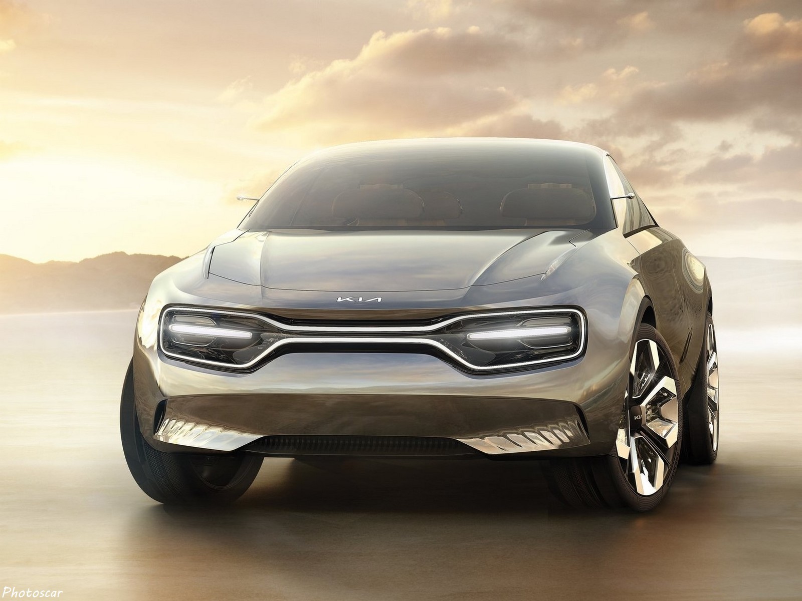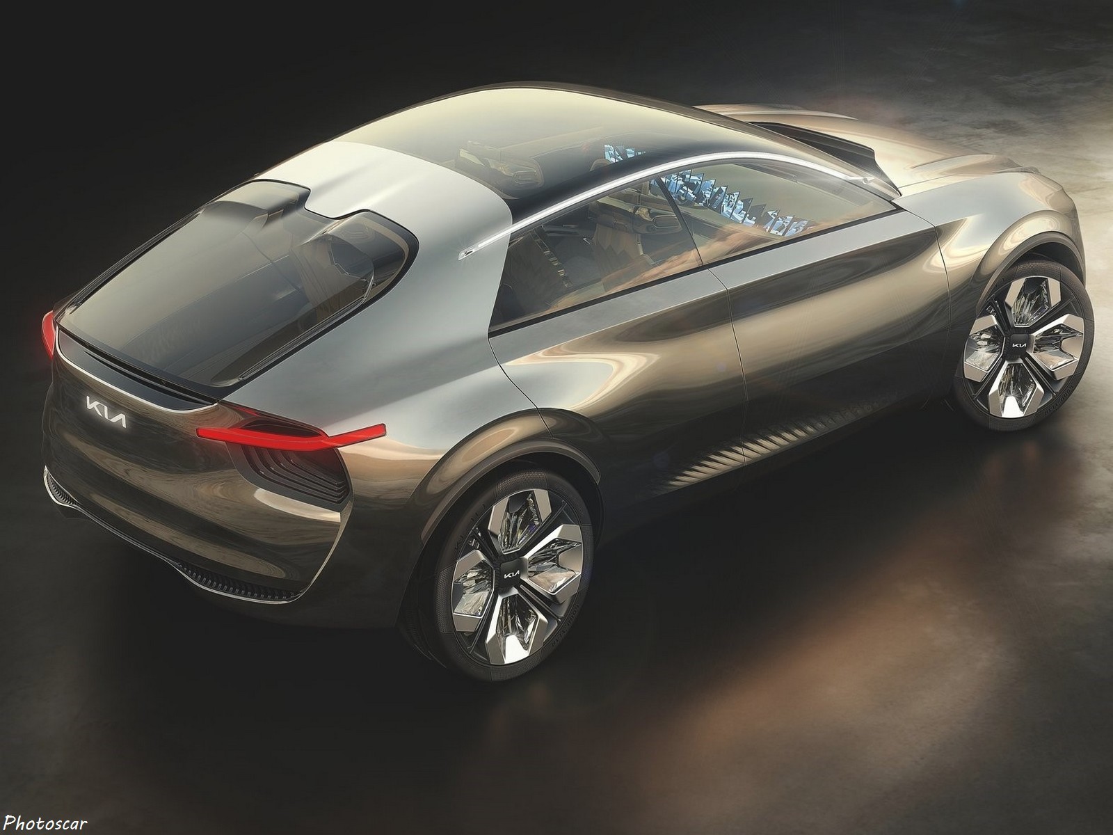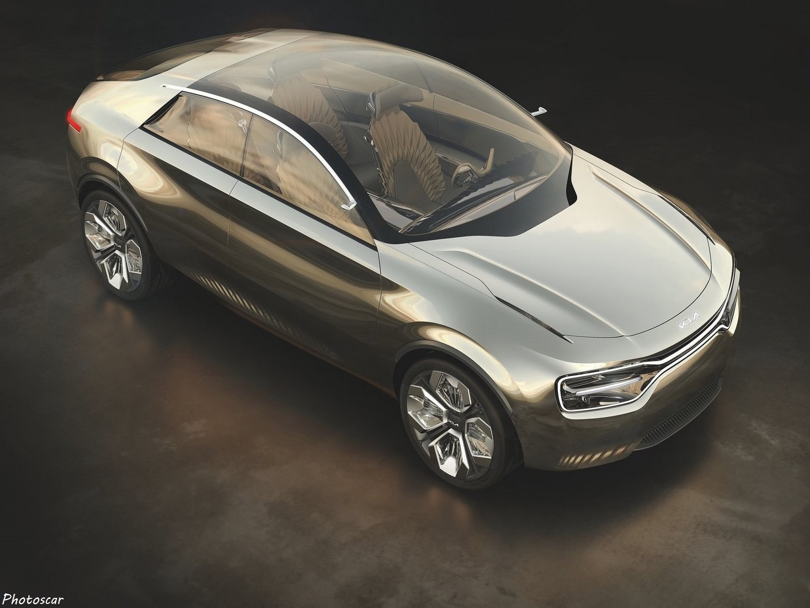 Imagine by Kia se compose de six couches de peinture chromée appliquée à la main! sur lesquelles les mêmes terrains ont appliqué une finition de couleur bronze. Son pare-brise se fond parfaitement dans le toit! tous deux fabriqués à partir d’une seule vitre en verre bombé. Une utilisation supplémentaire gratuite du verre peut_être trouvée dans les phares. Il semblent_être coulés dans des blocs de verre et soulignés par une bande de LED qui fait une nouvelle version des « narines de tigre » de Kia.