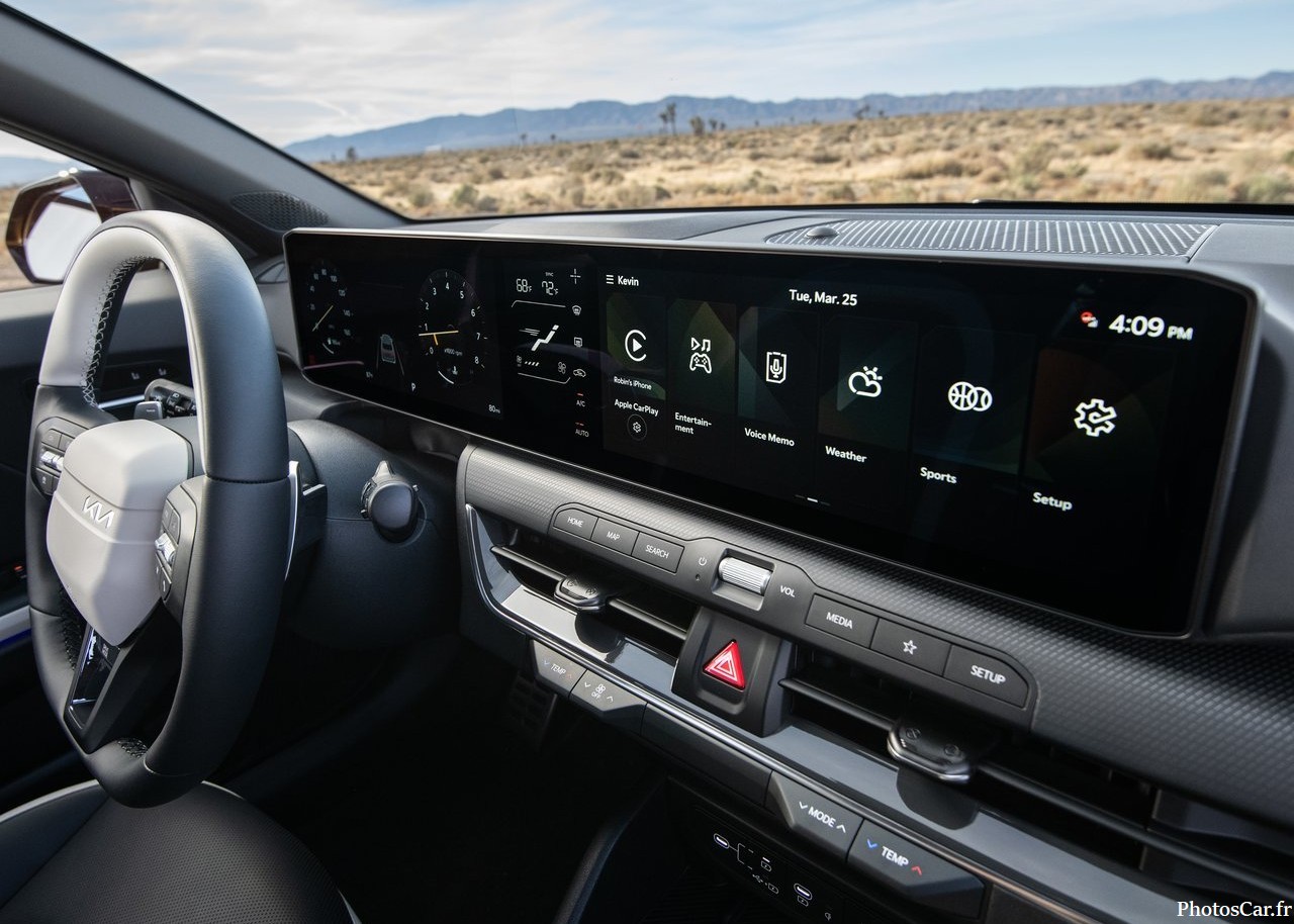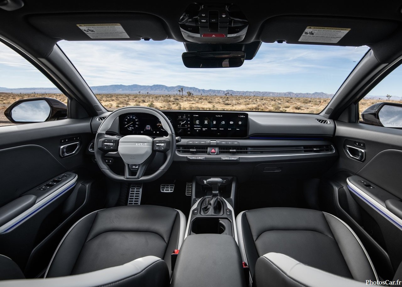 À l’intérieur, la Kia K4 Hatchback 2026 est un vrai centre de confort et de technologie. Le design de l’habitacle est soigné, avec des matériaux haut de gamme. Les sièges sont confortables, avec un excellent maintien, même lors de longs trajets. L’espace à bord est généreux, notamment pour les passagers arrière qui ne se sentiront pas à l’étroit. Côté technologie, l’infodivertissement est de dernière génération. L’écran tactile de 10,25 pouces est facile à utiliser. Il intègre les dernières fonctionnalités. Cela inclut la compatibilité Apple CarPlay et Android Auto. Vous aurez tout sous la main : musique, navigation, et même la gestion des systèmes de sécurité. L’ambiance à bord est moderne, et chaque détail semble avoir été pensé pour améliorer l’expérience utilisateur.