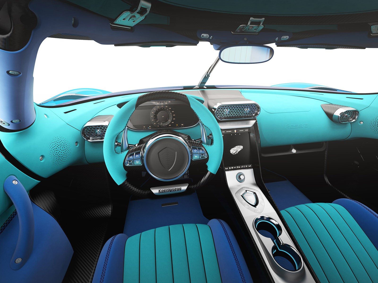 La Regera d’Elegance estfinie en bleu suédois. De plus elle a du carbone bleu teinté et des bandes vert océan. L’intérieur continue aussi cette combinaison de couleurs. Un intérieur bleu suédois et vert océan fabriqué à la main à partir d’un matériau scandinave remarquable pour sa texture luxueuse, sa dextérité et la manière durable dont il est fabriqué.
