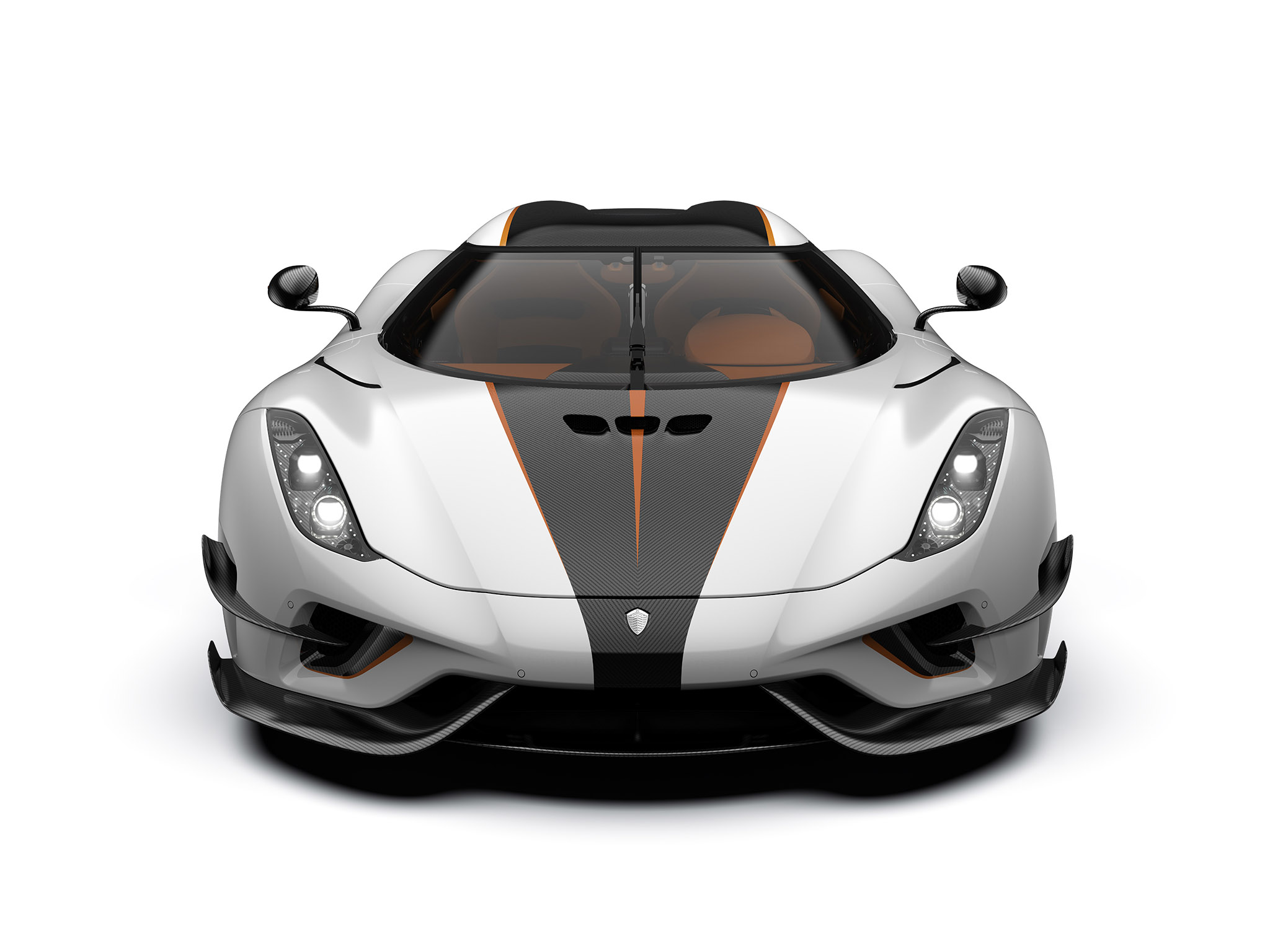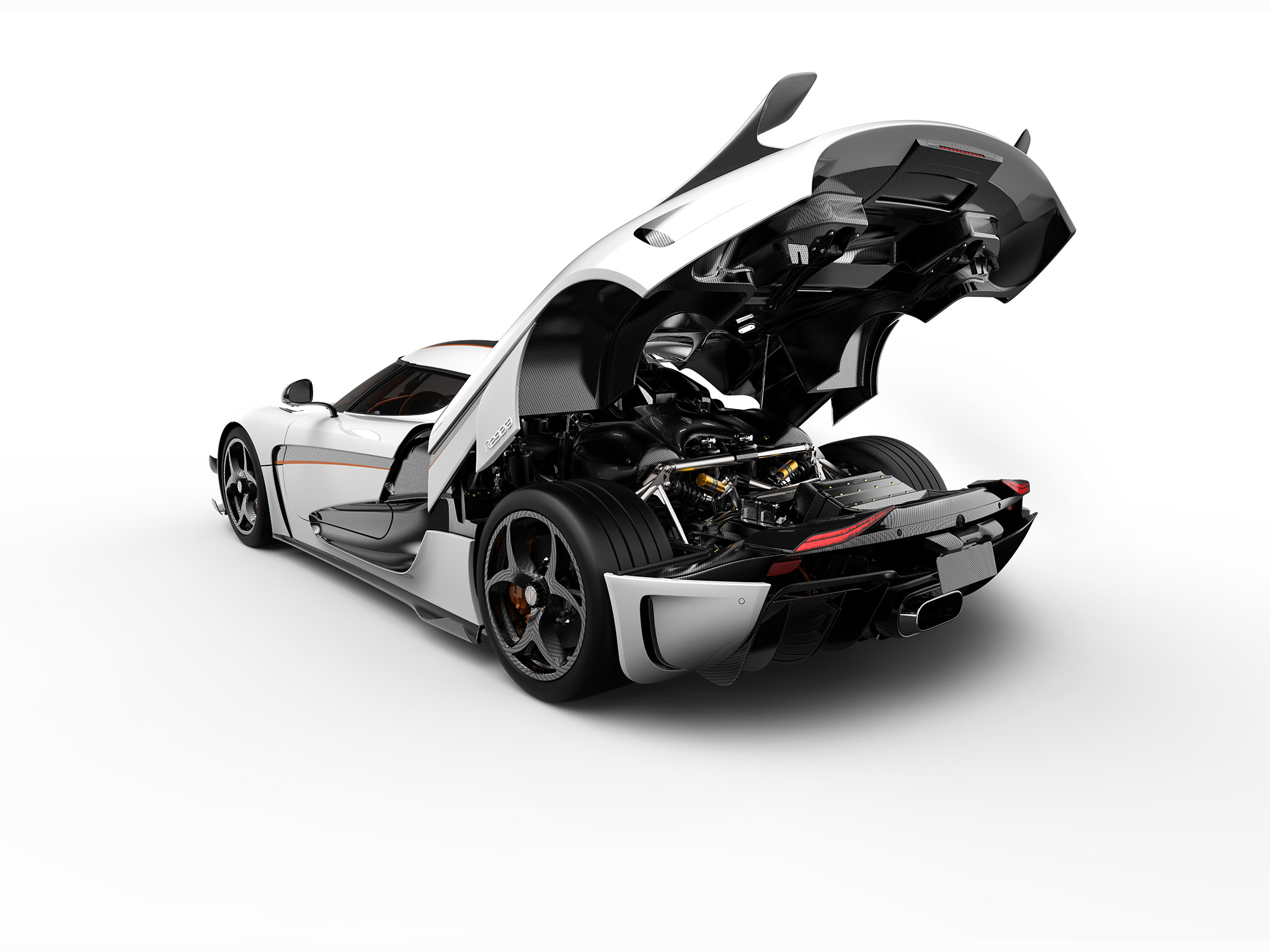 Le plus sportif Regera est fini en laque Crystal White. Aussi elle a une bande centrale en carbone transparent et des reflets Cone Orange. La voiture est équipée du paquet «Ghost» de Koenigsegg. Une série d’améliorations aérodynamiques qui donnent à la voiture une présence plus agressive. Elles fournissent une force d’appui supplémentaire lorsque cela est nécessaire.