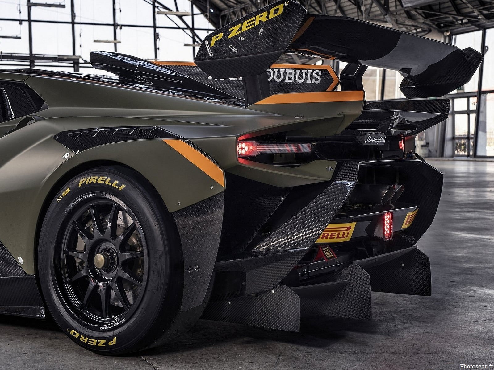 L’arrière, dominé par la grande aile en fibre de carbone, s’inspire du minimalisme et de la légèreté. Les cadres des nouveaux groupes de lumières LED rendent hommage au design de la Countach . Soutenus efficacement par le pare-chocs arqué en fibre de carbone! qui relie harmonieusement les appendices aérodynamiques situés derrière les roues aux ailettes du diffuseur redessinées.