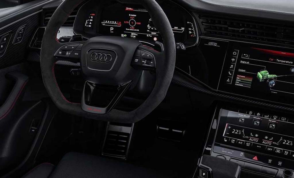 La société n’a pas non plus oublié l’intérieur de l’ Audi RS Q8 : les spécialistes de l’atelier sont prêts à revêtir l’intérieur du crossover «chargé» avec du cuir de haute qualité aux accents dorés ou rouges.