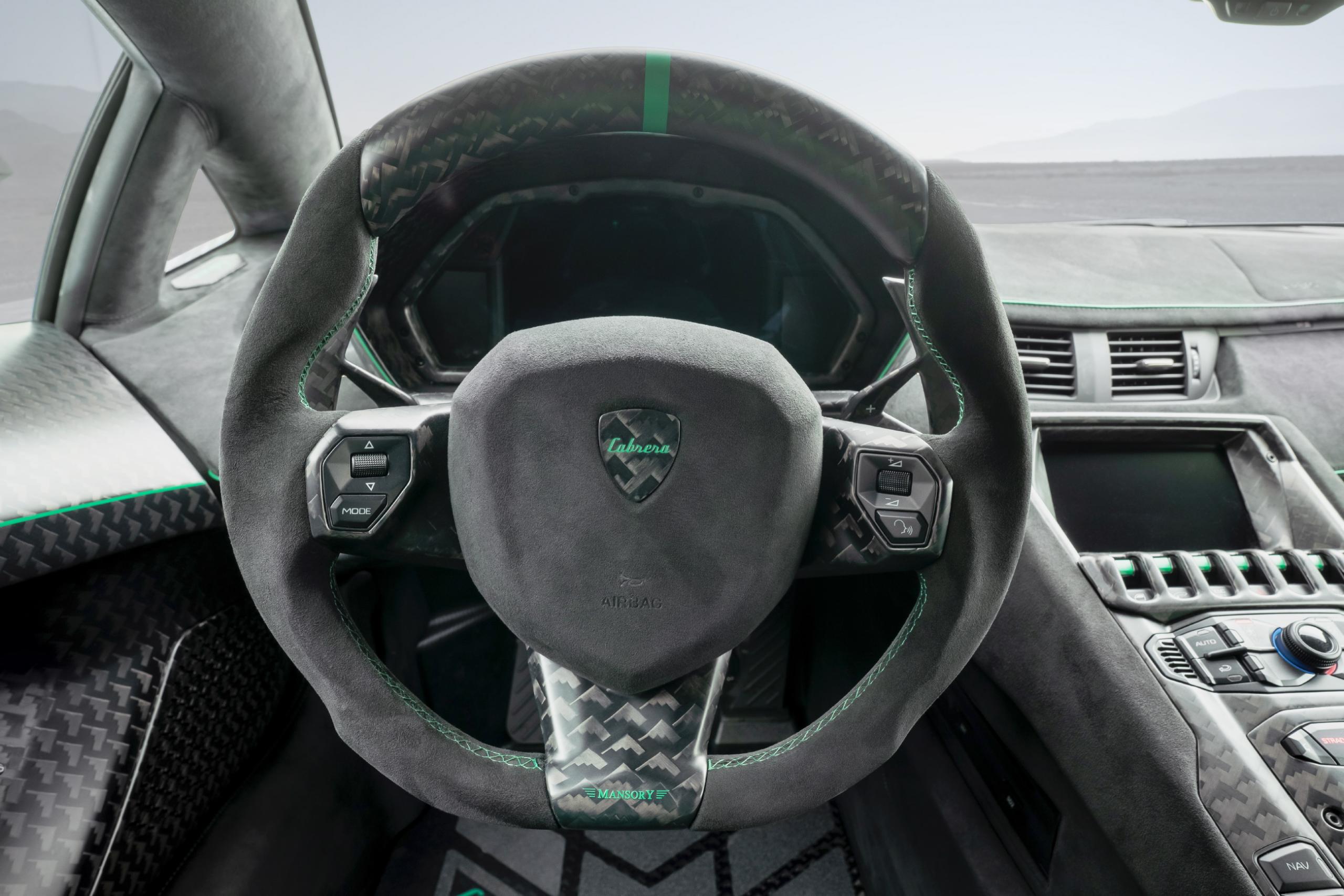 Le thème extérieur vert se poursuit dans l’habitacle! avec des coutures décoratives en forme de flèche distinctes avec des graphiques en carbone forgé. Il y a beaucoup d’utilisation d’Alcantara et de fibre de carbone! Les touches uniques incluent le badge Cabrera sur le tableau de bord. Il y a aussi de nouveaux tapis de sol. Des poignées de porte en cuir vert complètent l’ensemble.