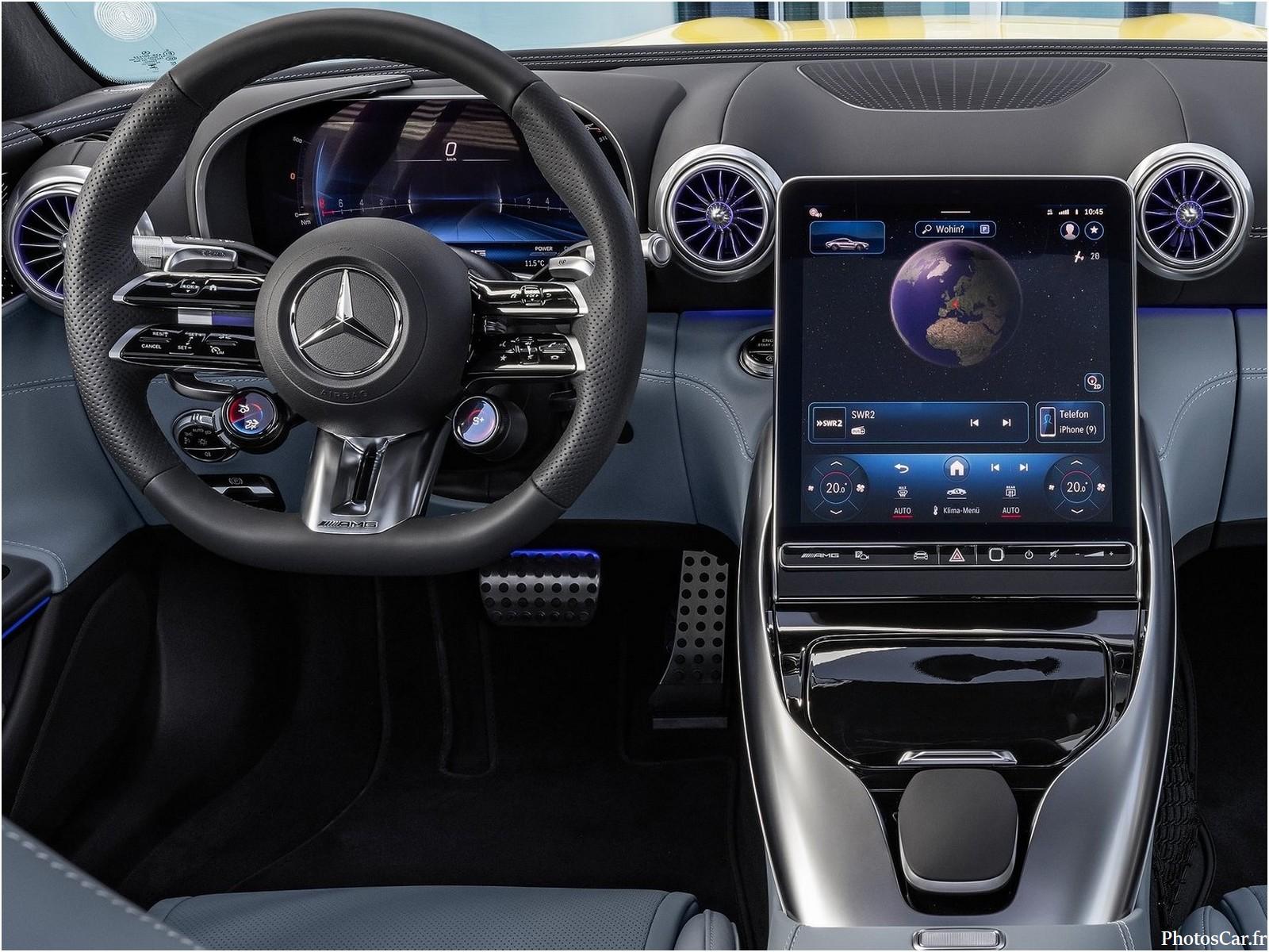 À bord de la Mercedes AMG GT43 Coupé 2025, c’est du sérieux. L’ambiance est sportive, mais jamais austère. Les matériaux sont haut de gamme : cuir, aluminium, inserts en carbone. Le volant AMG à méplat tombe parfaitement sous la main. Les sièges baquets offrent un maintien impeccable, même en conduite dynamique. Et pourtant, le confort est là. On peut rouler longtemps sans fatigue. L’instrumentation numérique MBUX est ultra complète. Écran central tactile, affichage tête haute, commandes vocales : tout est intuitif. L’éclairage d’ambiance ajoute une touche de raffinement. Même les passagers arrière ont droit à leur espace, bien que limité.