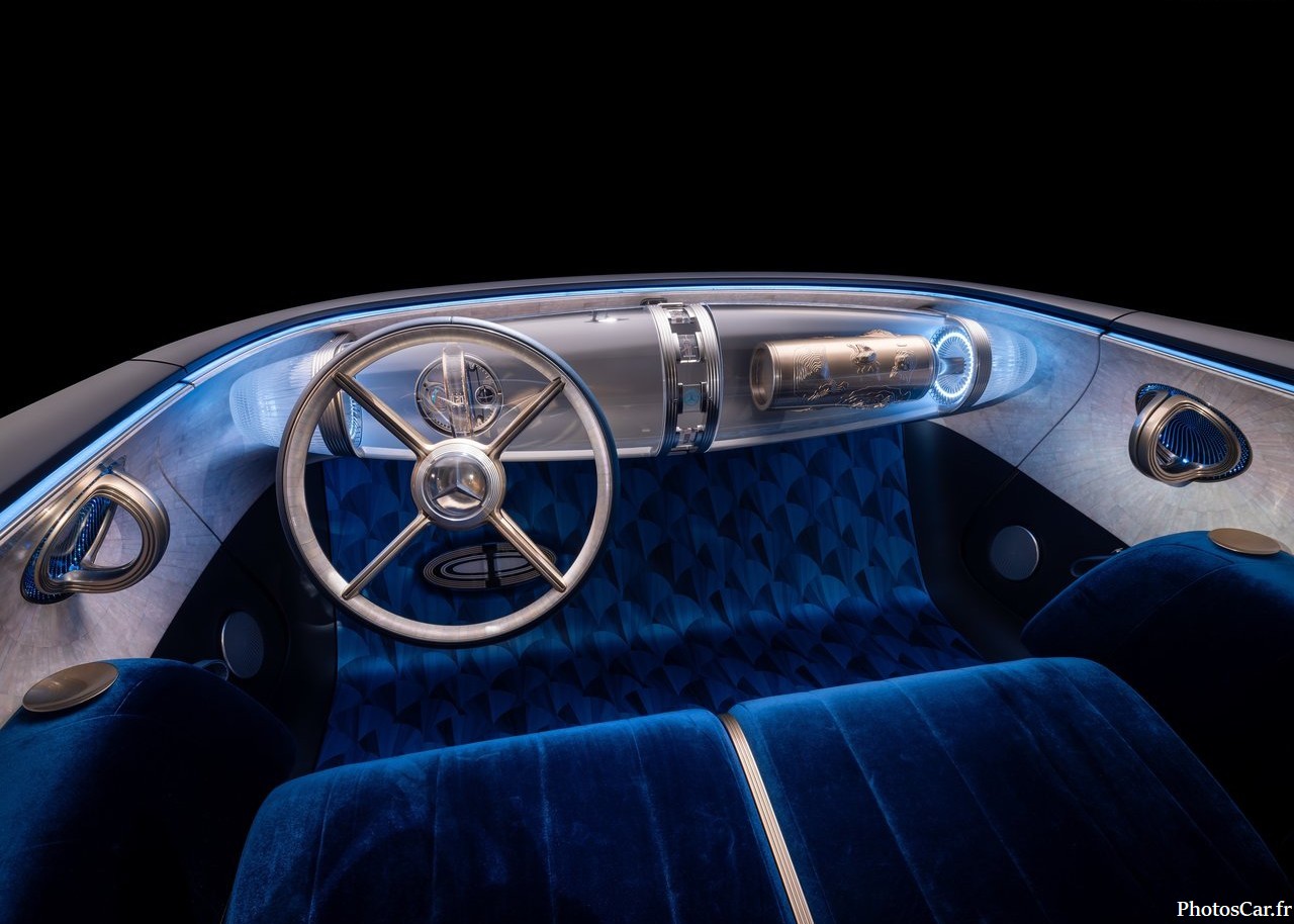 Oubliez les écrans partout. Oubliez les interfaces froides. L’intérieur de la Mercedes Vision Iconic Concept 2025 est un manifeste contre la sur-digitalisation. Ici, place à l’hyper-analogique. Les matériaux sont nobles : velours bleu profond, bois, cuivre, verre suspendu. L’ambiance est feutrée, presque théâtrale. On se croirait dans un salon privé des années 30, revisité par un designer du futur. Les commandes sont tactiles, mais discrètes. L’éclairage est indirect, modulable. L’espace est généreux, pensé pour le confort absolu. Ce n’est pas un habitacle. C’est une expérience sensorielle. Mercedes assume un retour à l’essentiel, à l’émotion, à la matière. Et ça fonctionne. L’intérieur de la Vision Iconic est un cocon. Un lieu de contemplation. Un manifeste esthétique.