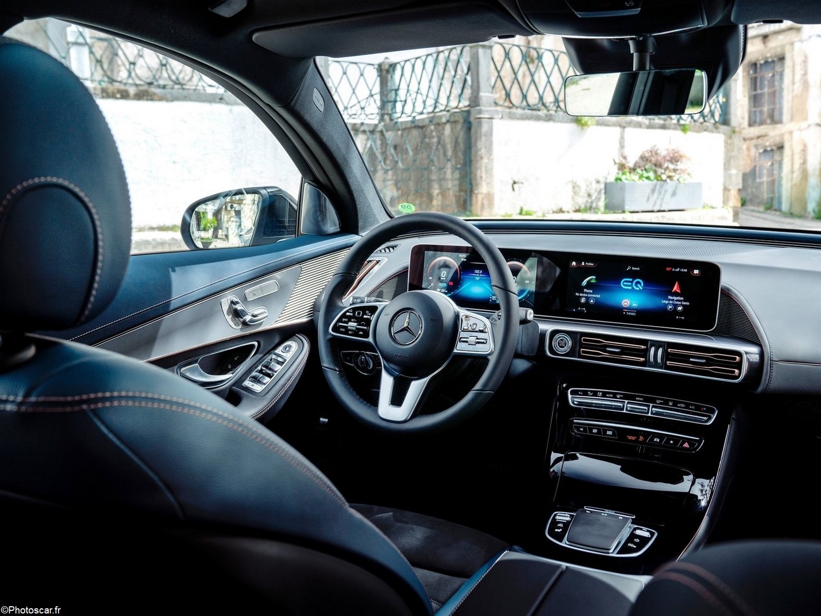L’attrait exclusif perdure à l’intérieur. Par exemple, il y a les nouvelles conceptions de sièges. Elles ont un garnissage en cuir artificiel ARTICO. Vous trouverez aussi une microfibre DINAMICA en bleu indigo et noir. Un lettrage spécial EQC Edition 1886 [est] brodé dans les dossiers des sièges. Le lettrage peut également être trouvé sous forme de badge sur la console centrale. Ce niveau de détail est également évident dans les éléments de finition spécifiques de couleur argent. Il est aussi visible dans les tapis de sol avec la broderie « EQC ».