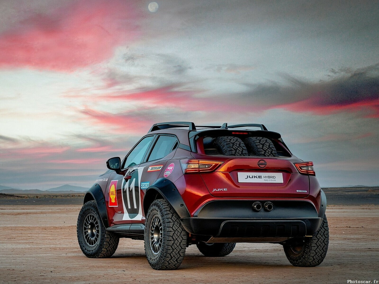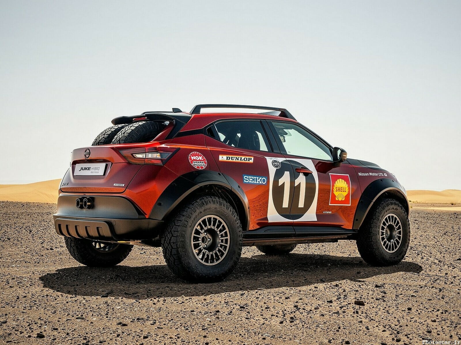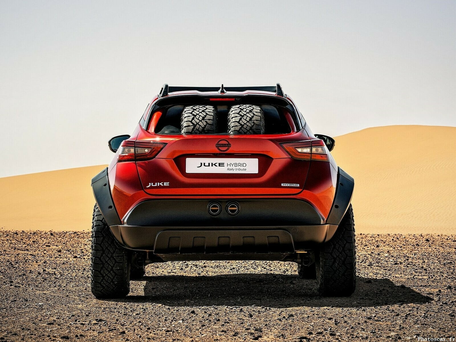 Voici le Nissan Juke Hybrid Rally Tribute Concept. Bien sûr, le mot Rally attire ici l’attention – c’est vraiment un concept qui nous rappelle l’histoire du rallye de Nissan. C’est vraiment un concept qui suit tous les « canons du genre » : grosses roues tout-terrain, suspension modifiée et garde au sol augmentée, cadre dans l’habitacle, deux roues de secours dans le coffre. Ça a l’air cool!