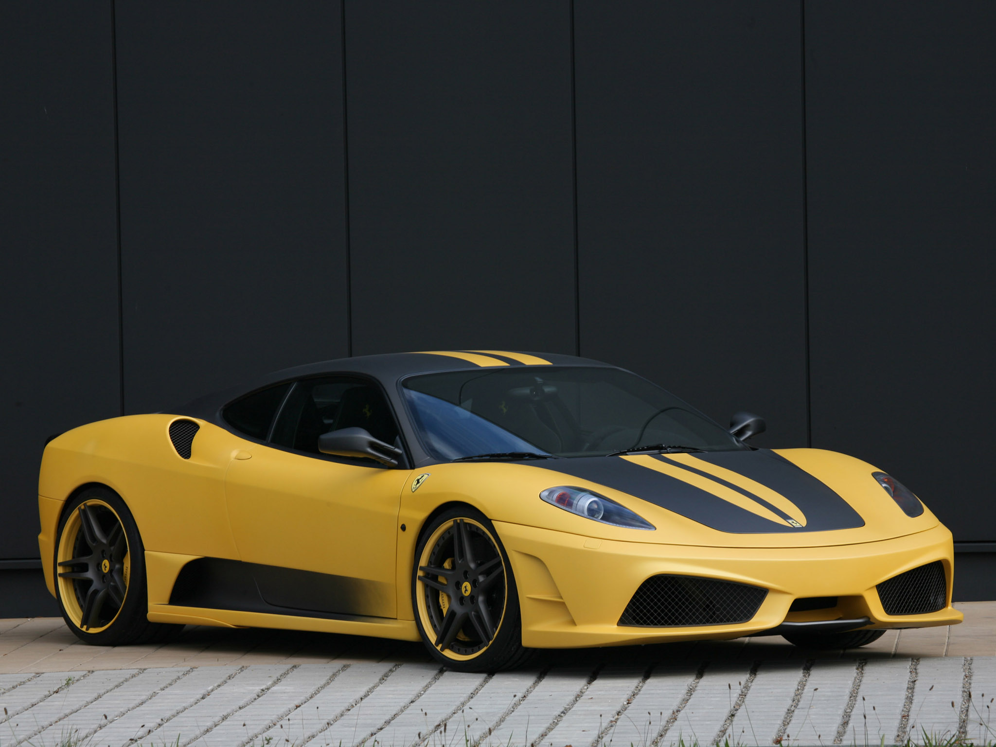 Un travail de peinture spécial (mais pas particulièrement attrayant) colore la 430 Scuderia jaune et gris mat! ce qui, je pense, finit par être un peu trop «boy-racer». De plus grandes roues créées juste pour cette voiture correspondent à la couleur de la peinture! et Novitec ajoute du noir feux arrière, balises latérales et réflecteurs. De nombreux composants du moteur sont donc remplacés par une pièce en fibre de carbone mate.