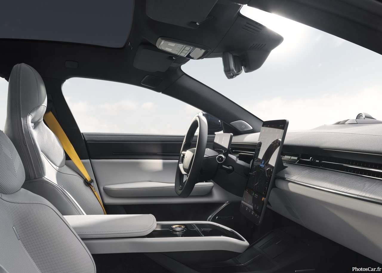 Le design extérieur de la Polestar 5 2026 est une vraie leçon de style. Longue de 5,09 mètres, large de 2,02 mètres, elle impose une présence. Mais elle reste fluide, avec un Cx de 0,24, digne d’un avion. Les lignes sont tendues, les surfaces épurées. On sent l’influence du design scandinave, minimaliste mais expressif. À l’avant, la SmartZone remplace la calandre classique, encadrée par des phares Pixel LED à double lame. C’est futuriste, mais pas clinquant. À l’arrière, pas de lunette. Juste une caméra centrale et une barre lumineuse aérodynamique. Le toit panoramique est gigantesque : 2 mètres de long, 1,25 mètre de large. Il inonde l’habitacle de lumière. Chaque détail est pensé pour l’aérodynamisme et l’élégance. Même les poignées sont affleurantes. En bref, la Polestar 5 2026 ne ressemble à rien d’autre. Et c’est tant mieux.