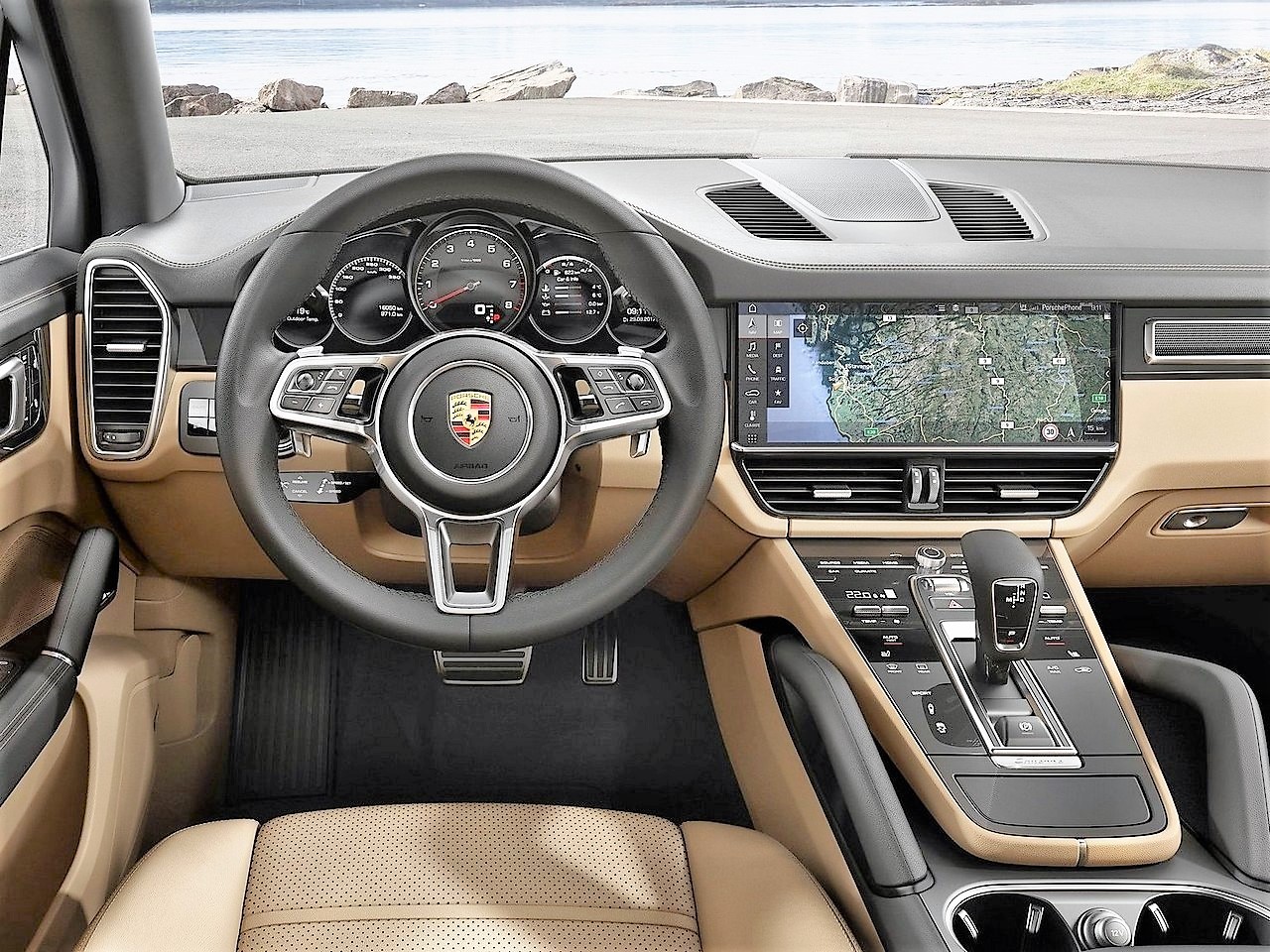 Typique d’une voiture de sport, la console centrale remonte vers la planche de bord pour réduire la distance entre volant et principales commandes. Le volant sport multifonction parle le même langage : celui des courses. Il hérite des lignes de la 918 Spyder qui lient avec harmonie esthétique futuriste et ergonomie. Pourtant le concept Cayenne dépasse la simple dimension sportive. Son PCM avec module de navigation et surface en verre sans cadre s’intègre parfaitement dans la console centrale. Sport, confort, élégance. Le soin apporté à chaque détail magnifie l’ensemble du design pour mieux laisser s’épanouir vos émotions.