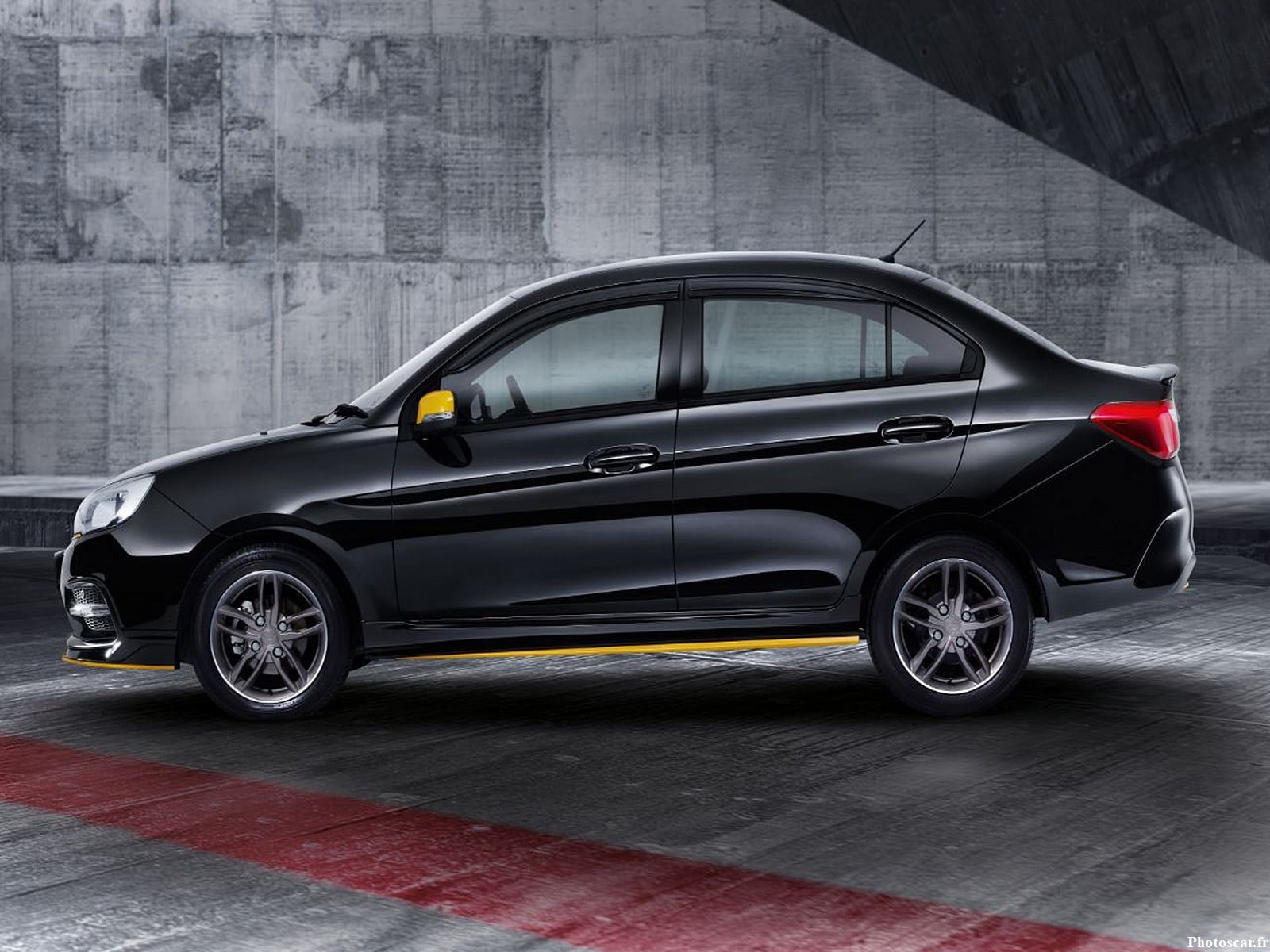 L’extérieur sombre est ensuite rehaussé de reflets jaunes sur la calandre et la lèvre du pare-chocs avant. Les accents jaunes continuent sur les jupes latérales et les capuchons de rétroviseurs extérieurs sur le profil. À l’arrière, le point le plus bas du pare-chocs reçoit une bande jaune pour refléter la partie avant. Pourquoi jaune ? C’est une référence au bras de sport automobile de Proton, R3.