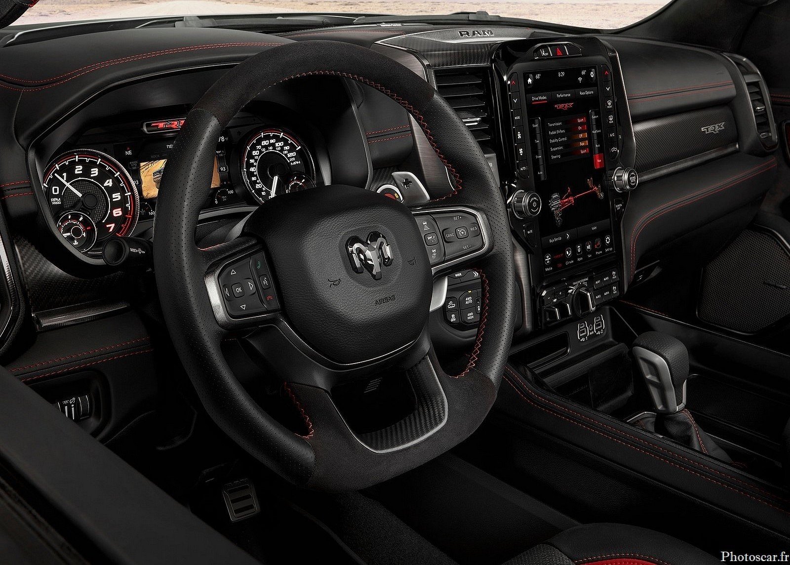 Le camion – équipé en option de cuir, de suède et de fibre de carbone de haute qualité. Chaque option disponible sur le Ram 1500 est là pour le trajet et plus encore. Une «plaque de spécifications» personnalisée sur la console centrale est une autre touche agréable. Il répertorie le type de compresseur utilisé par le TRX, la puissance de suralimentation, la puissance et le VIN. Désormais, vos passagers sauront toujours que votre camion a 702 chevaux.