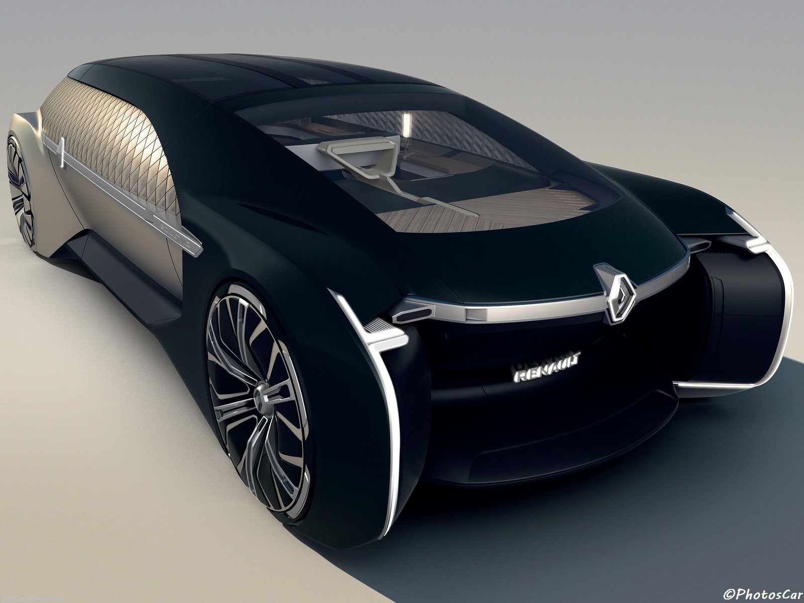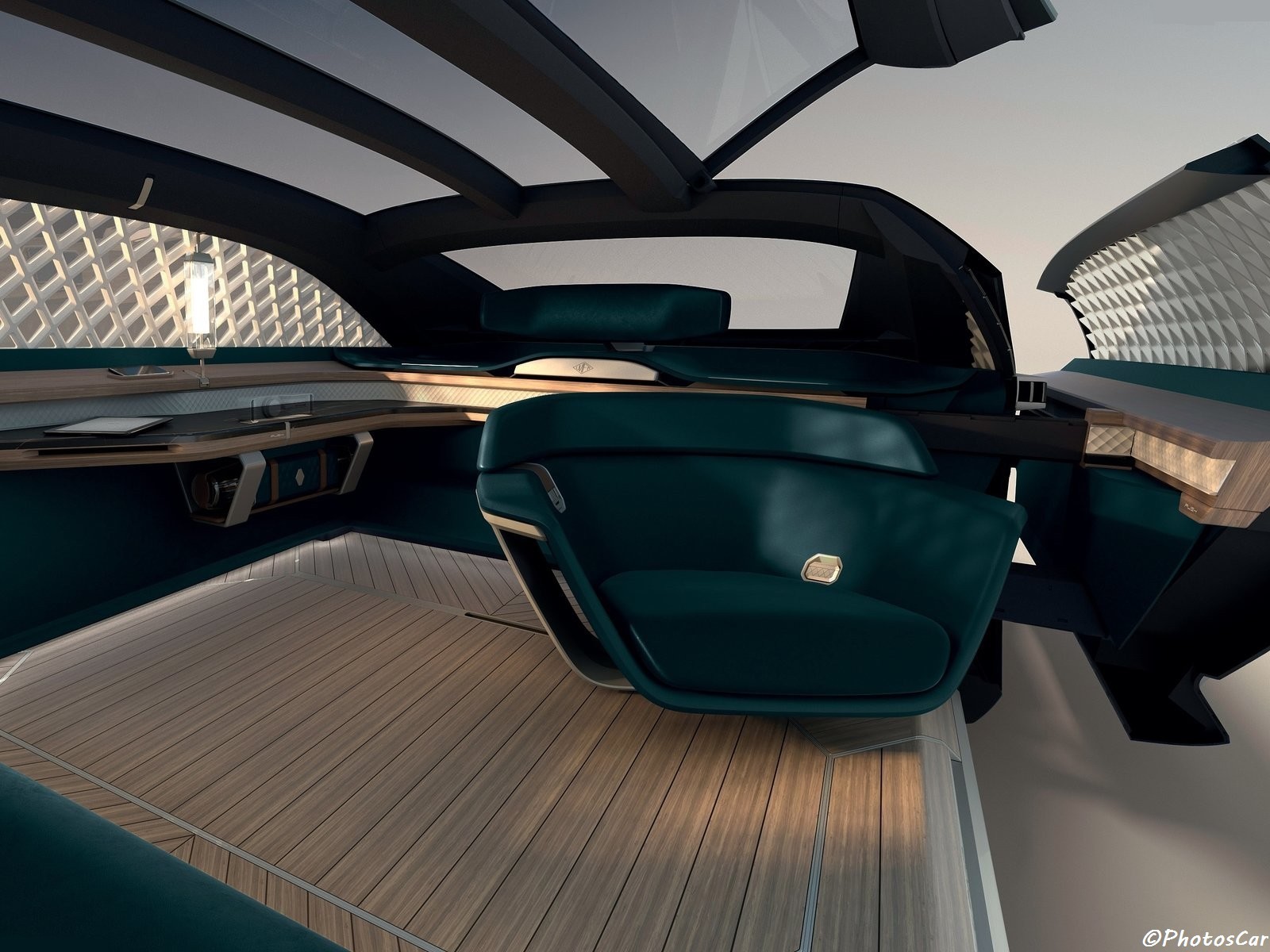 L’intérieur de la Renault EZ-Ultimo correspond à l’extérieur extravagant avec des surfaces en marbre véritable. Accompagnées de boiseries, de cuir et de luminaires avec boutons de gradateur. Il y a un siège pivotant, semblable à un fauteuil, tourné vers l’arrière et une banquette en face de celui-ci. Aussi grosse que soit la voiture, elle ne peut accueillir que trois personnes au maximum. Le toit comporte des panneaux de verre segmentés. Les côtés sont vêtus d’une structure en treillis et de fenêtres occultées. Ce qui permet aux passagers de regarder le monde à l’extérieur tout en préservant leur intimité.