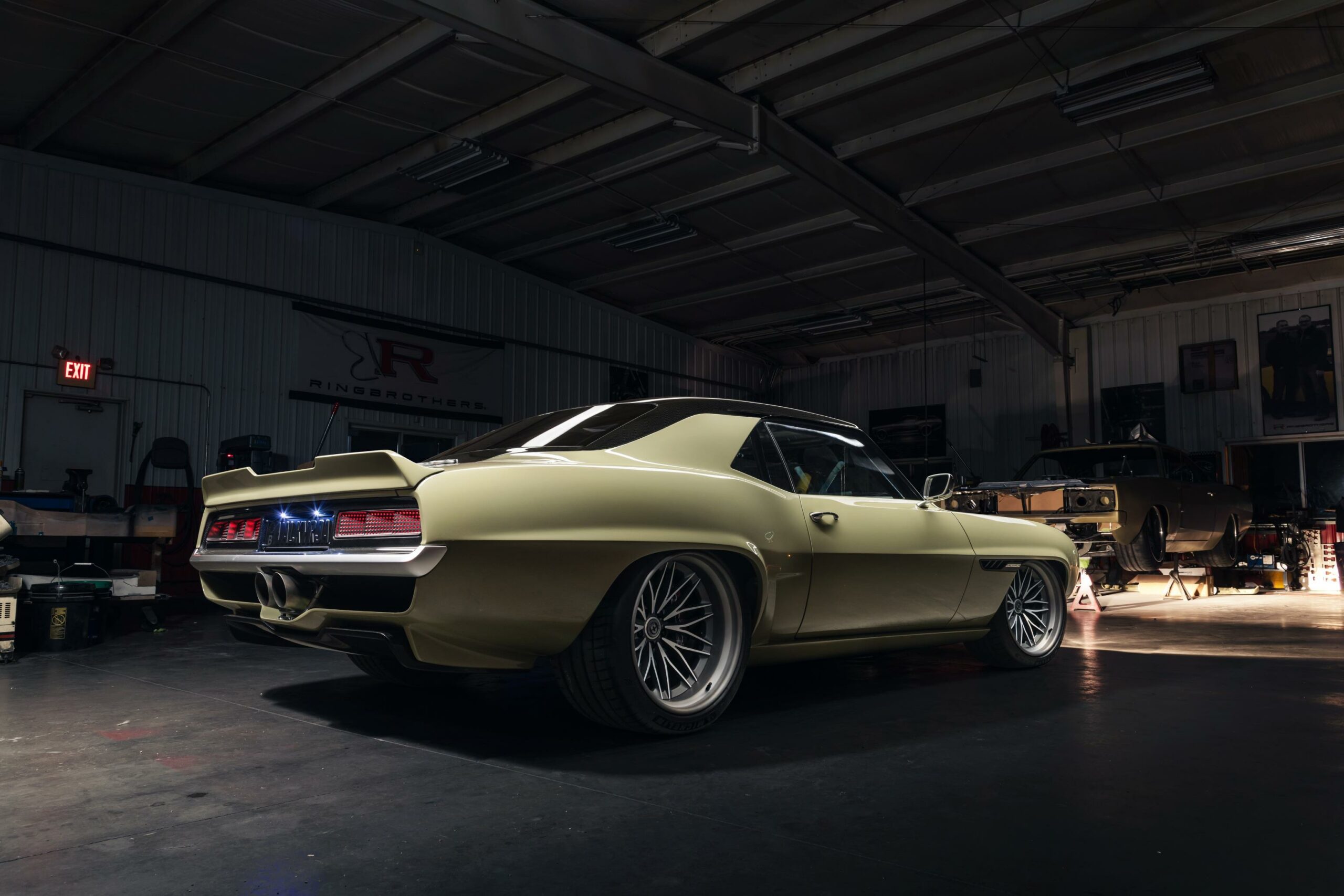 L’arrière montre de nombreux détails typiques d’une construction Ringbrothers. Les lignes classiques de la Camaro 1969 conservées, mais ont également des modifications de carrosserie inspirées de la course, telles que le centre de toit sculpté, les canaux d’air de la jupe arrière et l’échappement intégré.
