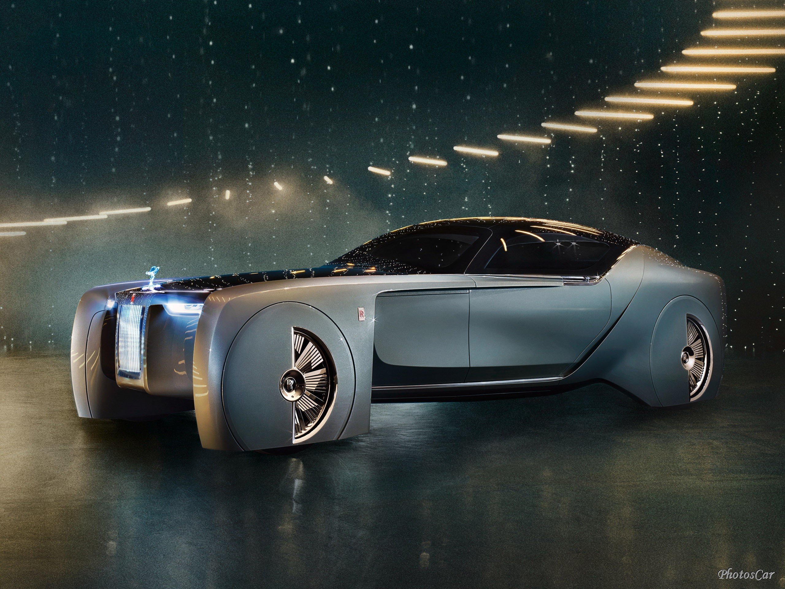 Cet étonnant concept, baptisé 103EX, reprend les formes massives chères à la marque de luxe en les épurant pour en faire un objet tout droit sorti d’un film d’anticipation. Doté d’un moteur zéro émission et capable de se diriger de façon autonome. La RollsRoyce Vision Next 100 reste un véhicule de prestige. Ainsi rien n’est trop beau pour son propriétaire, désormais installé dans un vaste habitacle dépourvu de chauffeur.