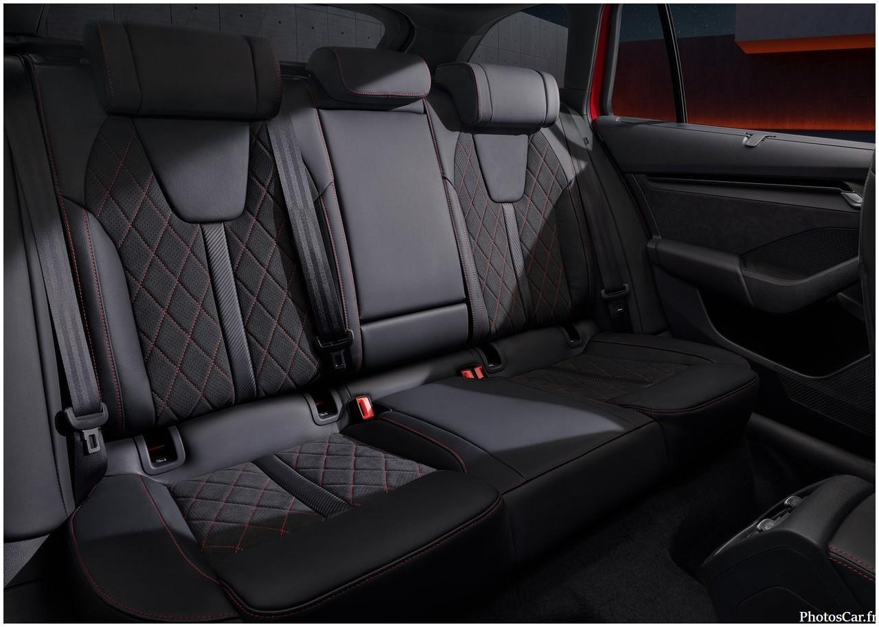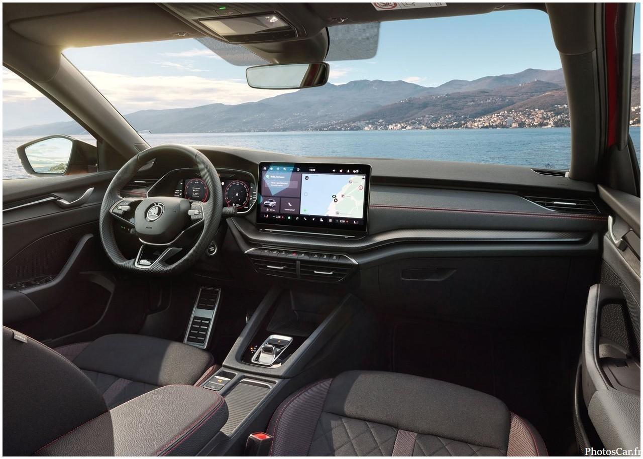 L’ intérieur de la Skoda Octavia RS 2025 mêle confort familial et ambiance sportive . Les sièges sport en tissu ou cuir , avec surpiqûres rouges, offrent un bon maintien. Ils permettent une position de conduite idéale .