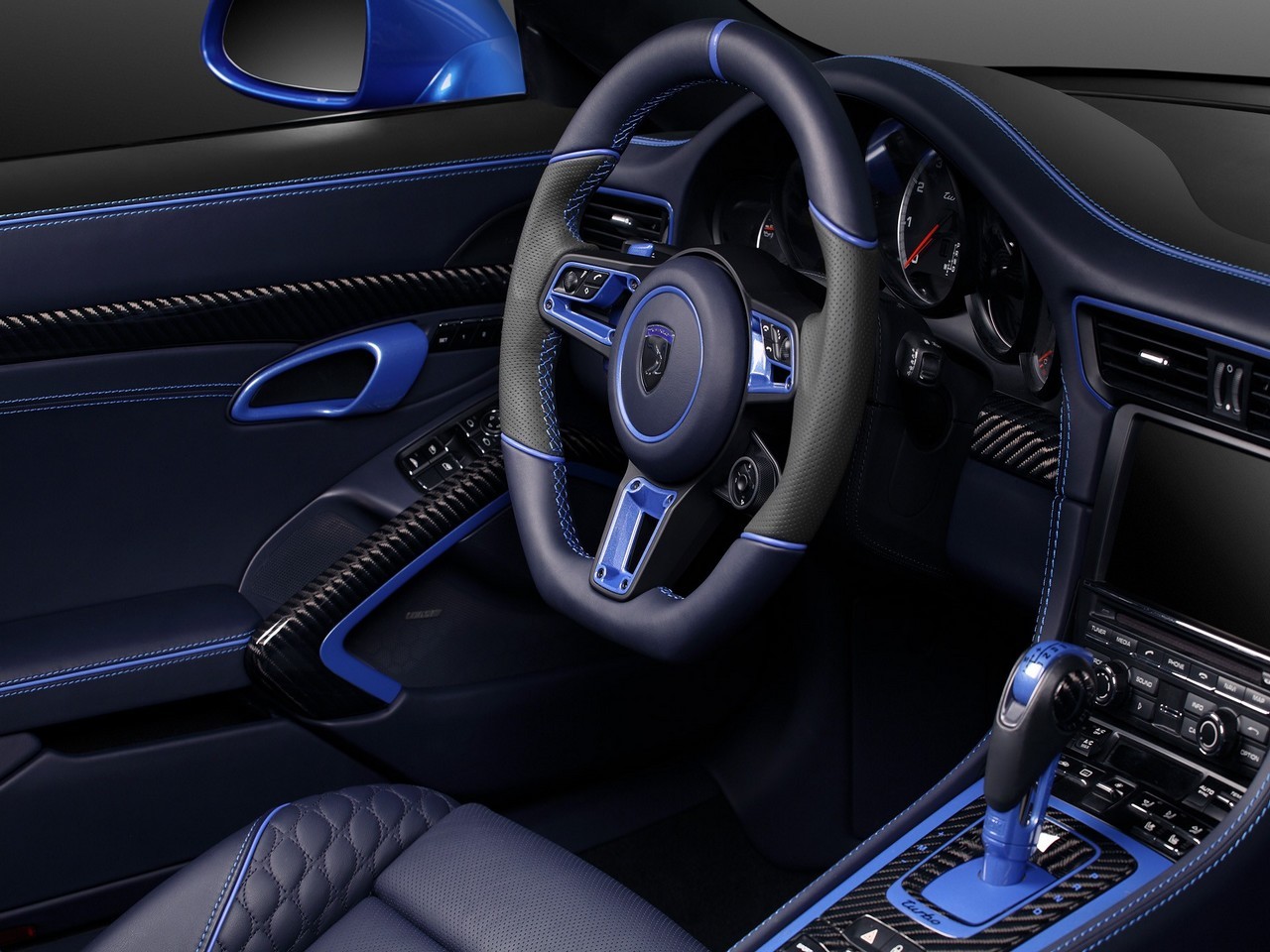 L’intérieur de la Porsche 991 Stinger GTR gen 2 by Topcar 2017 est un mélange de luxe et de sportivité. Les sièges sont en cuir noir avec des accents blancs, et le tableau de bord est recouvert de fibre de carbone. Le volant est également en fibre de carbone, avec des palettes de changement de vitesse en aluminium.