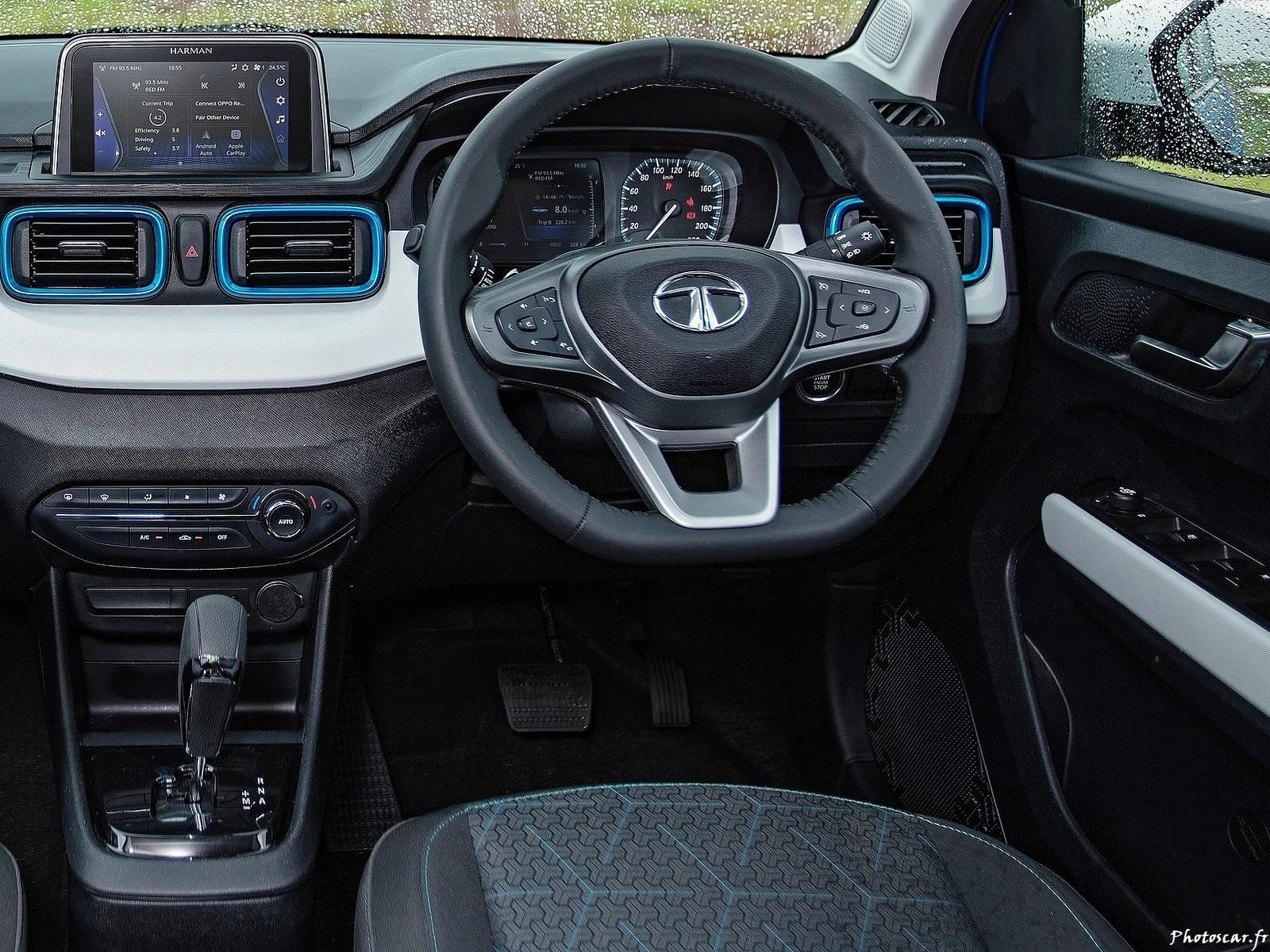 En ce qui concerne maintenant les intérieurs! la cabine bicolore noir et blanc cassé a également l’air très moderne et organisée. Le design minimaliste du tableau de bord est sans encombrement et ces évents horizontaux de climatisation avec des lunettes bleues renforcent son attrait funky. Le groupe d’instruments est similaire à ce que nous avons vu dans l’Altroz! et même la porte ouverte à 90 degrés de large, ce qui est encore une fois un report. Il offre 366 litres d’espace de coffre mais manque d’aérations arrière et d’accoudoir central avant.